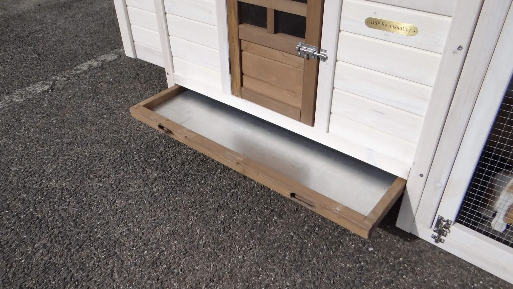 - Metalen schuiflade (zink) om het hok handig schoon te maken