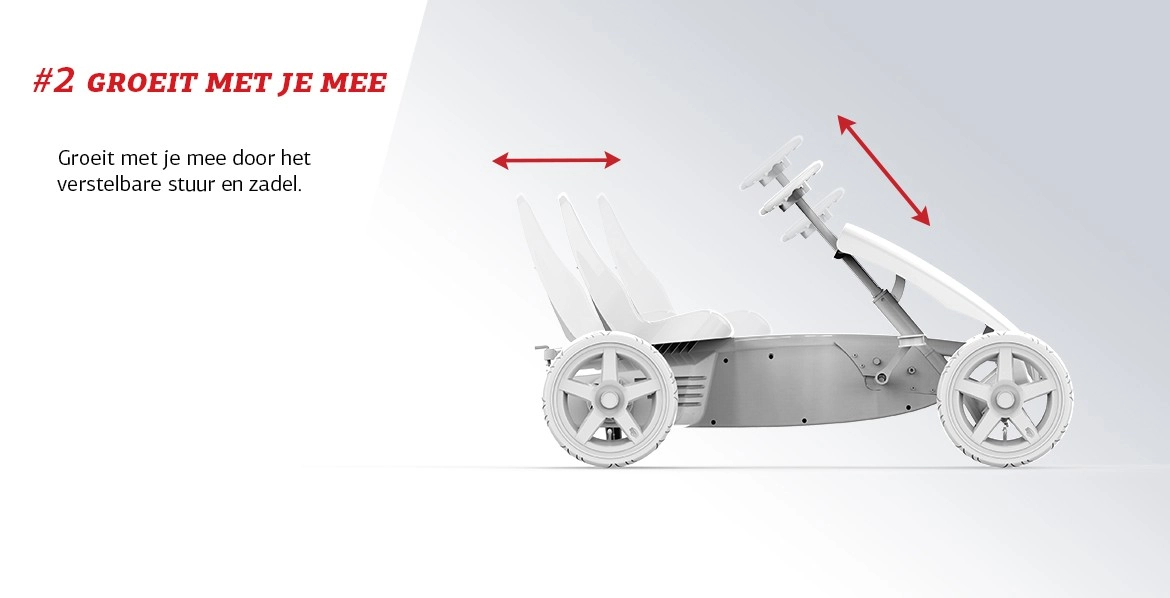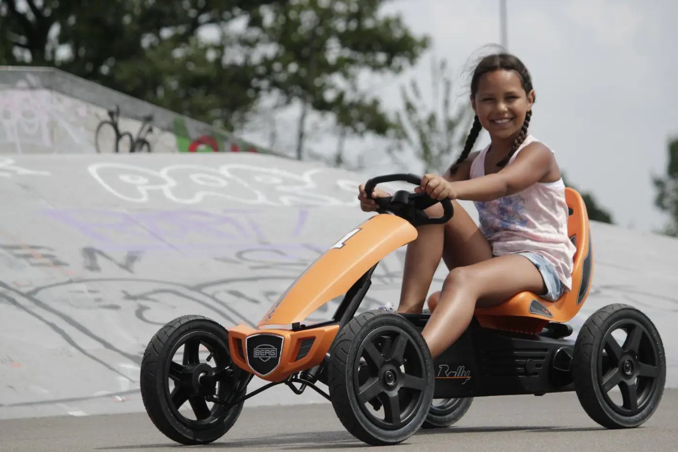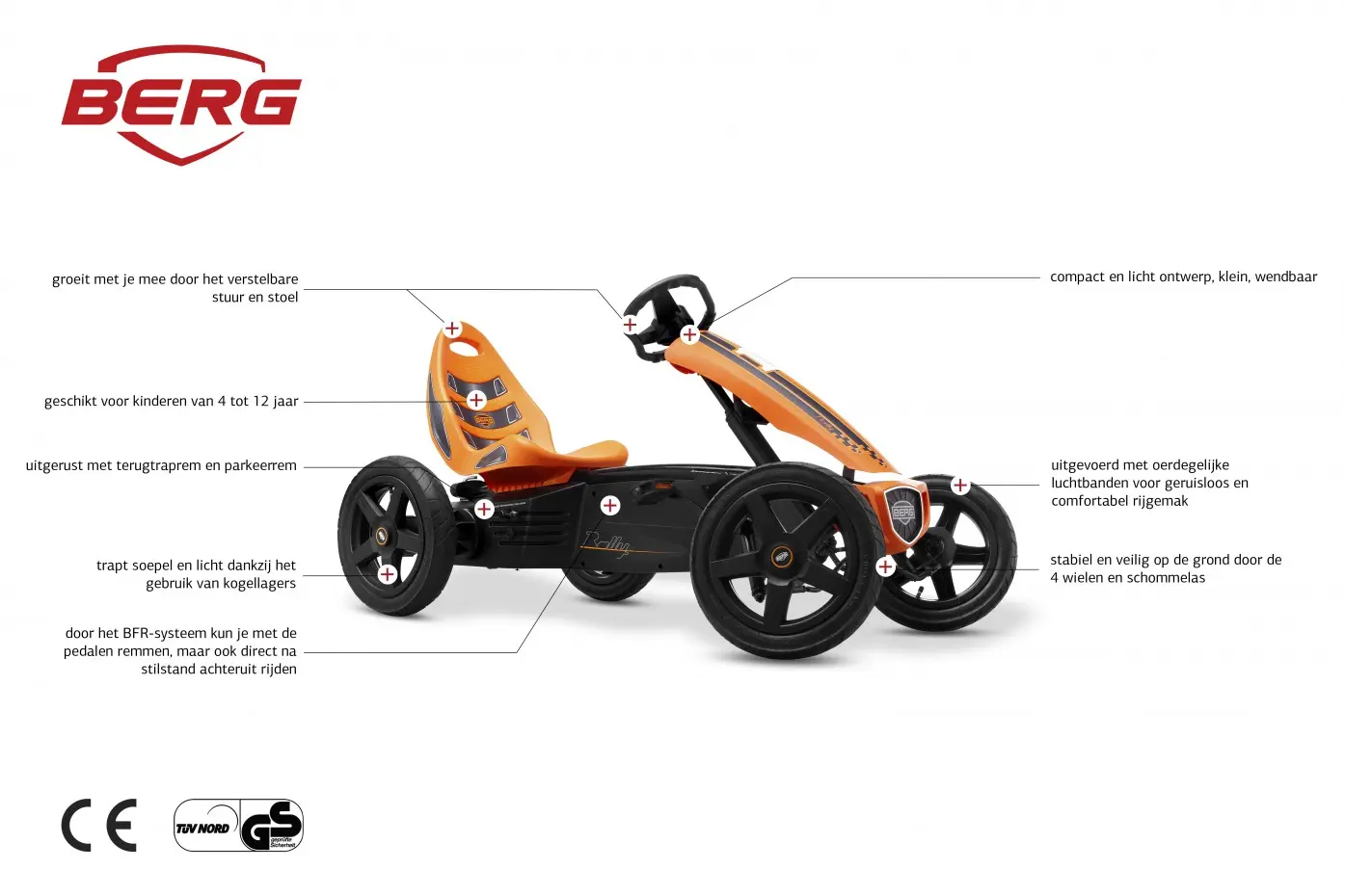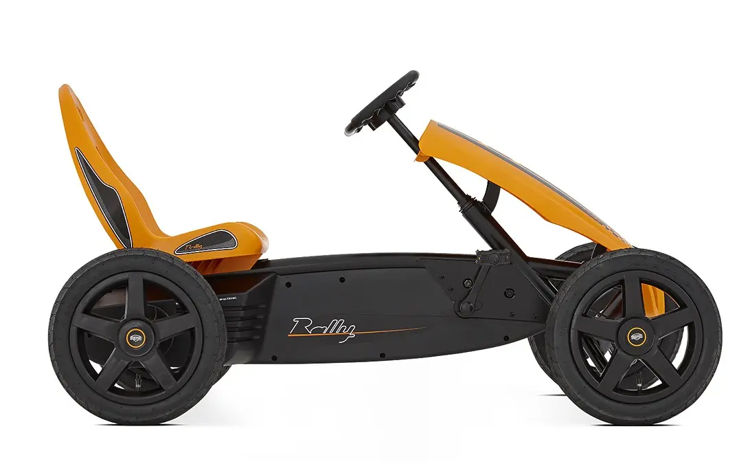 Snel, sneller, snelst. De BERG Rally heeft super mooie velgen met luchtbanden, zodat je niet alleen heel snel, maar ook comfortabel over de weg raast! Voor de deur, in de straat of op je favoriete veldje. Met de BERG Rally houd je samen met je vriendjes geweldige competities. Je nieuwe BERG skelter kan het allemaal.