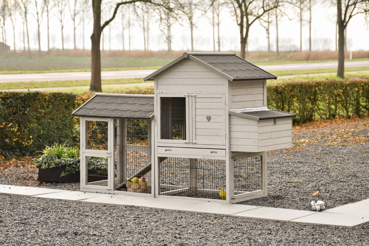 Kippenhok Prestige Medium met linkerren en legnest. Kippenhok Prestige Medium met legnest en linkerren is 'n geweldig hok voor uw kippen. Dit kippenhok is tot in detail uitstekend afgewerkt met diverse ruime deuren, royaal nachthok met zitstokken, handig legnest en ruime ren. Voor de optimale bescherming staat het kippenhok op rubberen poten. Dit maakt kippenhok Prestige Medium zeer praktisch in gebruik. U kunt dit kippenhok ook met kleine aanpassing eenvoudig andersom opbouwen.