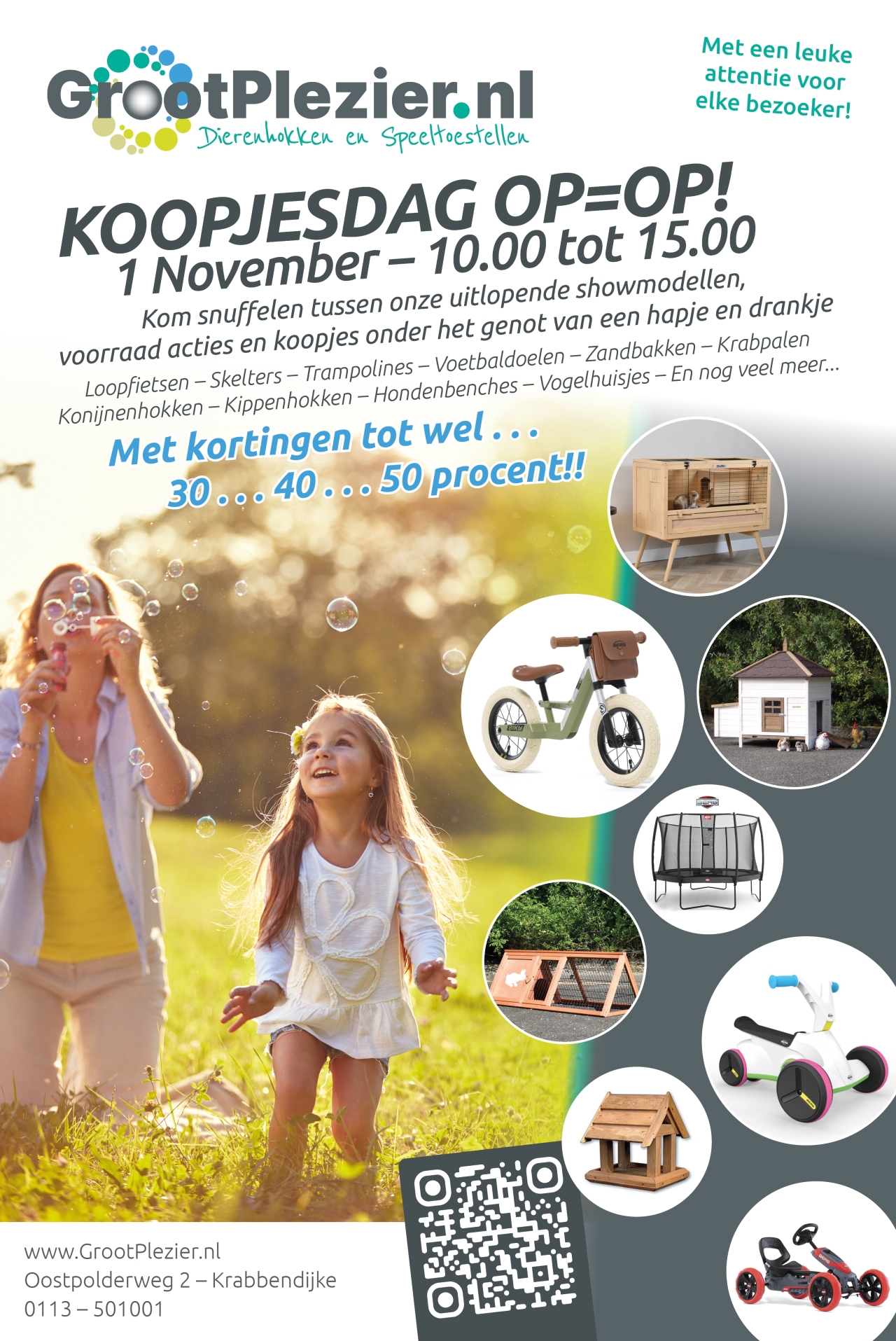 Op vrijdag 1 november 2025 is het Koopjesdag bij GrootPlezier.nl! Kom gezellig langs tussen 10.00 en 15.00 uur en snuffel tussen onze uitlopende showmodellen. Van kippenhokken en trampolines tot skelters en zandbakken: kortingen tot wel 50%.