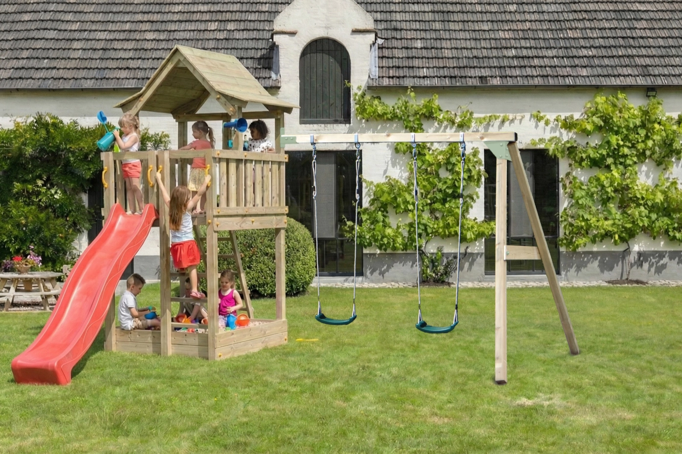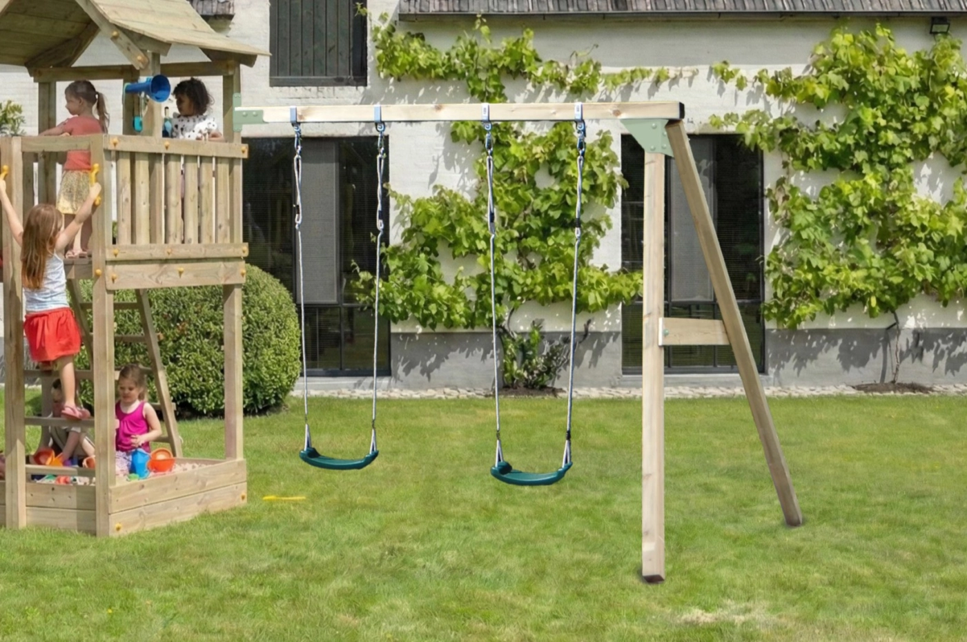 - De hoek tussen benen en ligger is haaks, waardoor de schommel weinig ruimte in beslag neemt en toch stevig is