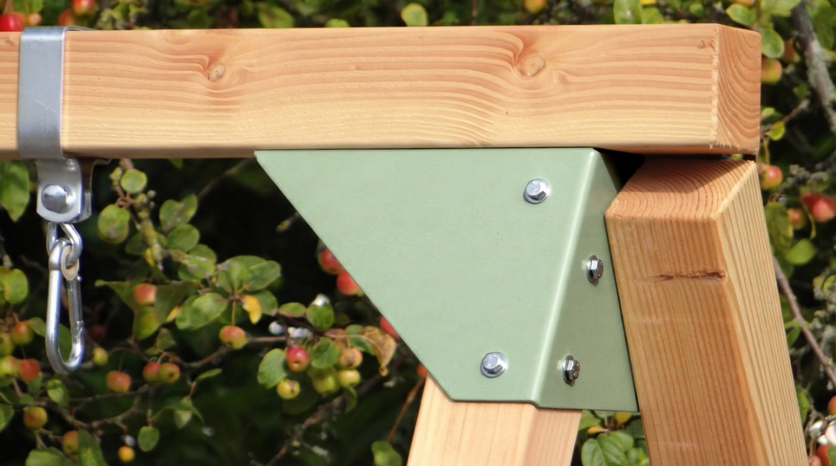- De hoek tussen benen en ligger is haaks, waardoor de schommel weinig ruimte in beslag neemt en toch stevig is