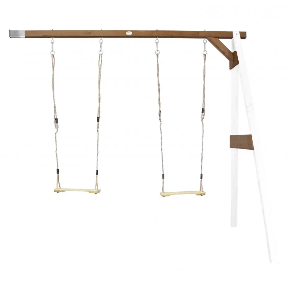 De unieke constructie van de AXI schommel is volledig gebouwd uit hout en voorzien van schoren voor extra stabiliteit. Dit zorgt ervoor dat de schommel perfect bij de natuurlijke omgeving van de tuin past. Deze AXI schommel is gemaakt van FSC 100% Hemlock hout en is daarnaast afkomstig van duurzaam beheerde bossen en daarom ook een milieubewuste keuze. Deze houtsoort splintert niet en is van nature bestand tegen weersinvloeden zoals regen en dus resistent tegen houtrot. De schommel is ook nog eens behandeld met een watergedragen beits, zonder chemicaliën. Je hoeft deze voor gebruik dus niet te behandelen, kinderen kunnen er direct veilig mee spelen.