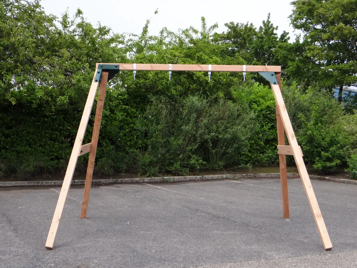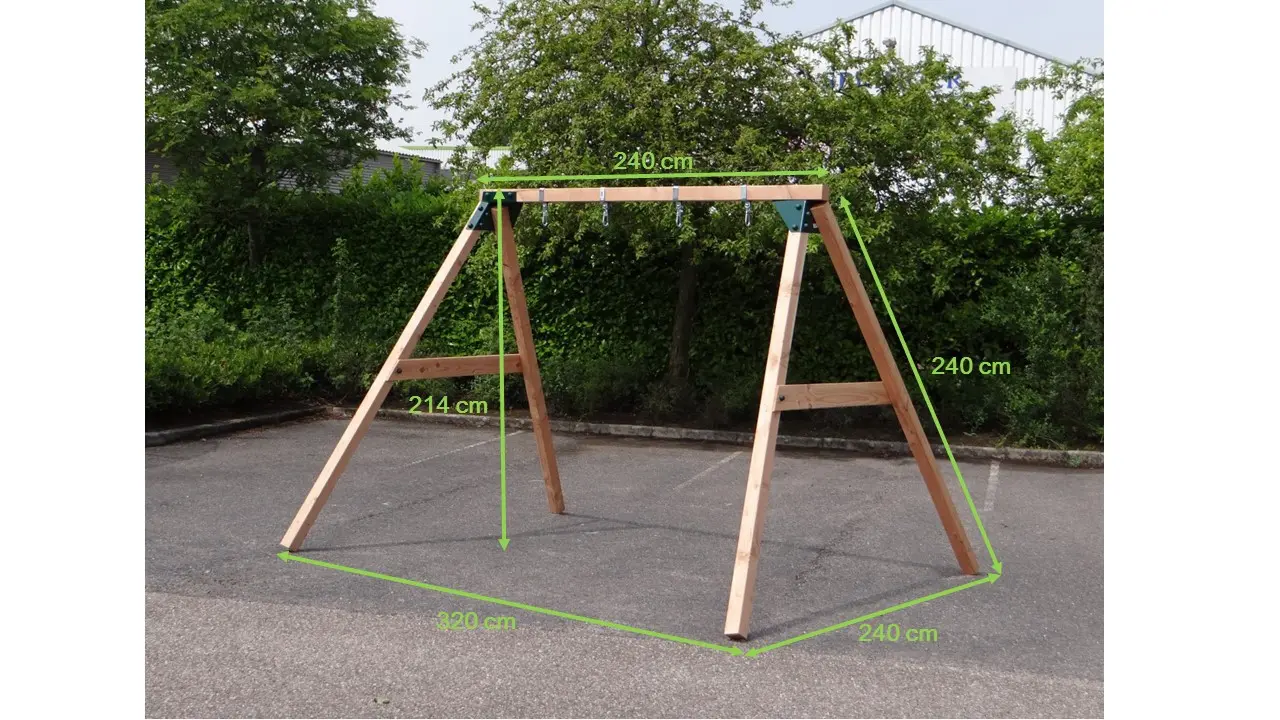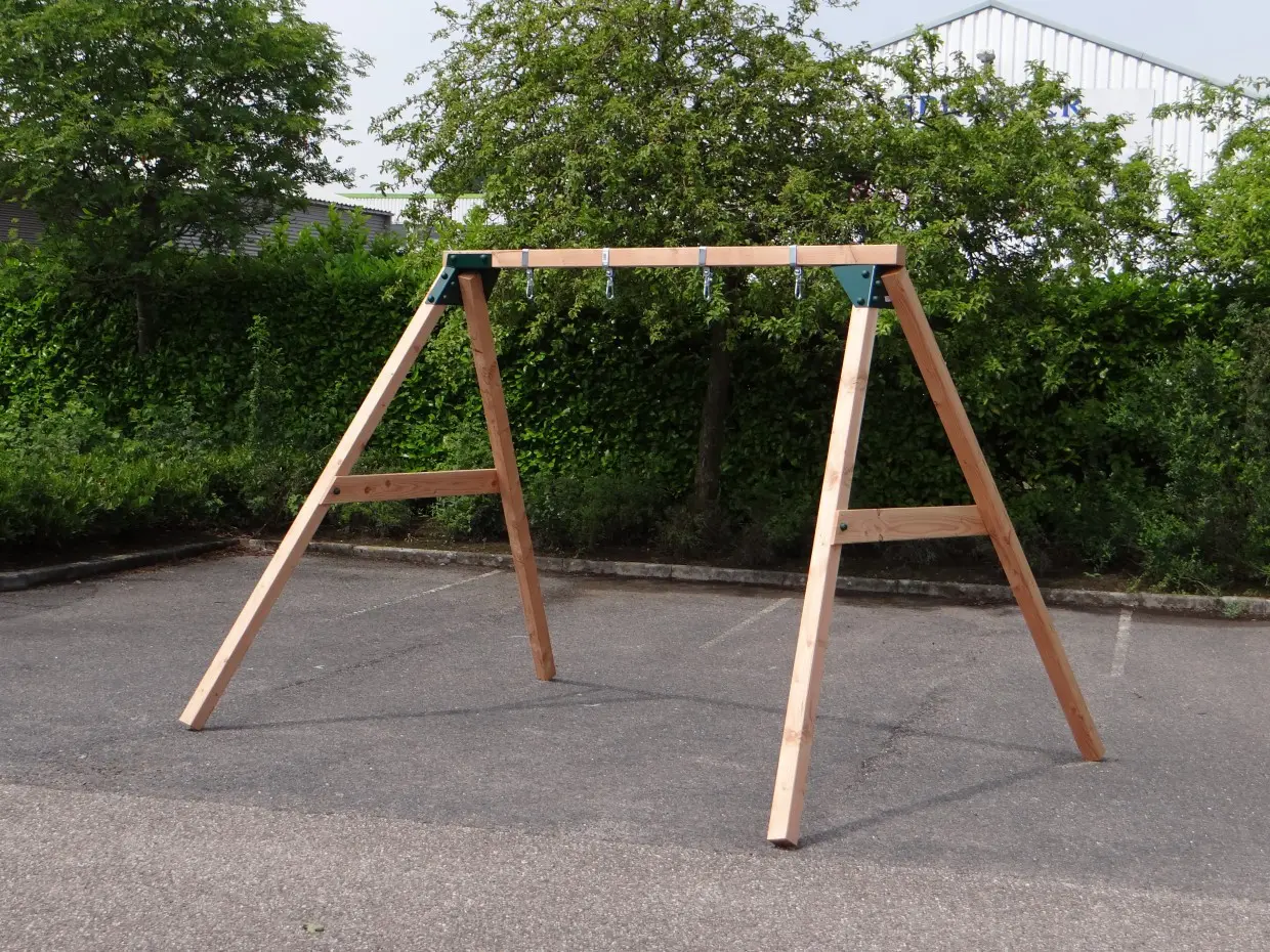 • De hoek tussen poten en ligger is 100º, waardoor alle poten iets uit elkaar staan en de schommel uiterst stabiel wordt