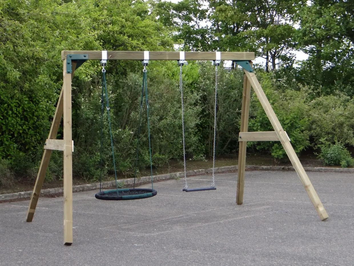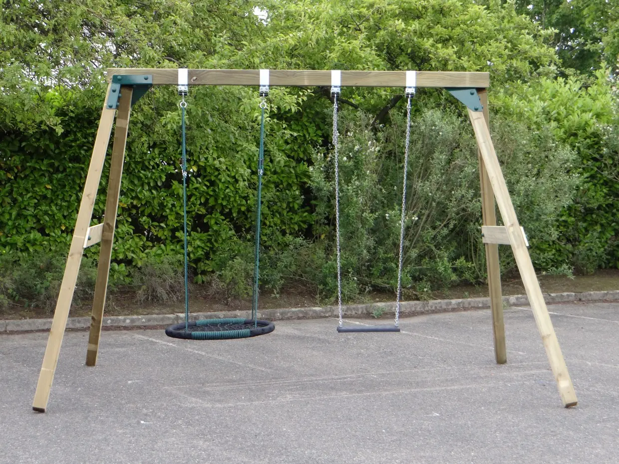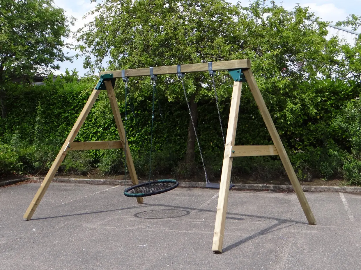 • De hoek tussen poten en ligger is 100º, waardoor alle poten iets uit elkaar staan en de schommel uiterst stabiel wordt