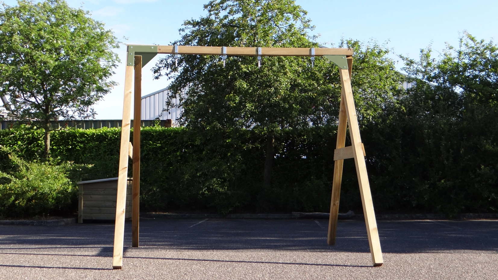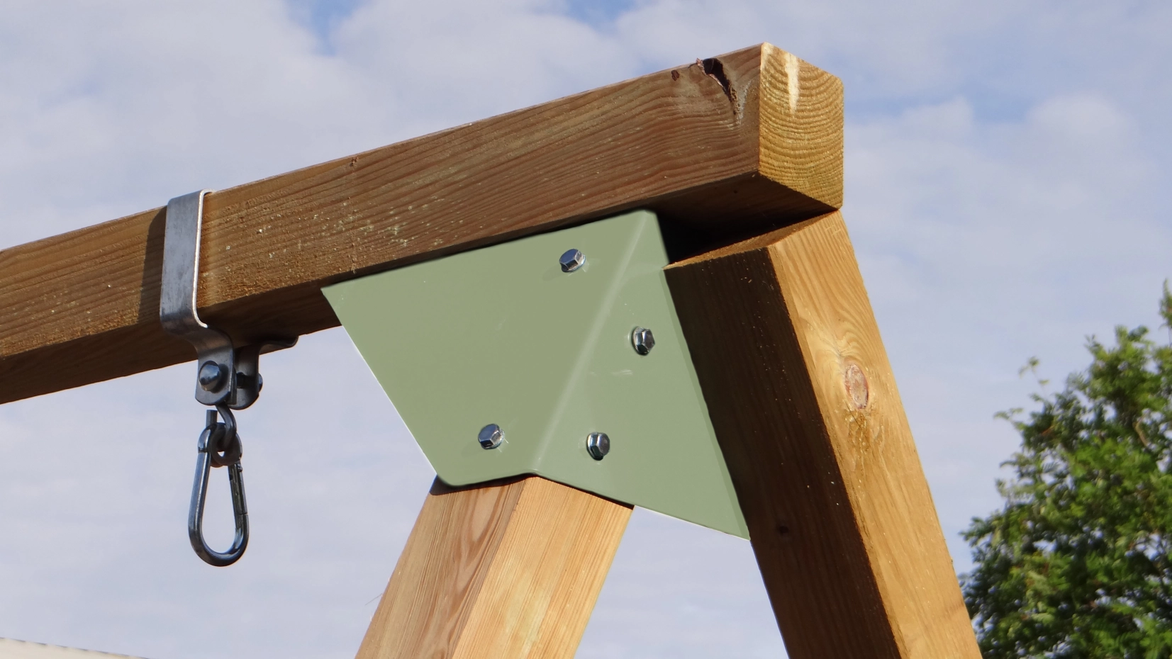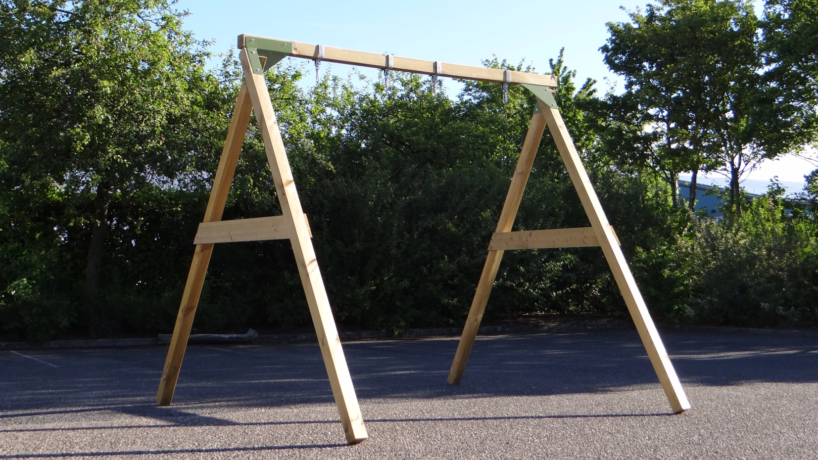 - De hoek tussen benen en ligger is haaks, waardoor de schommel weinig ruimte in beslag neemt en toch stevig is