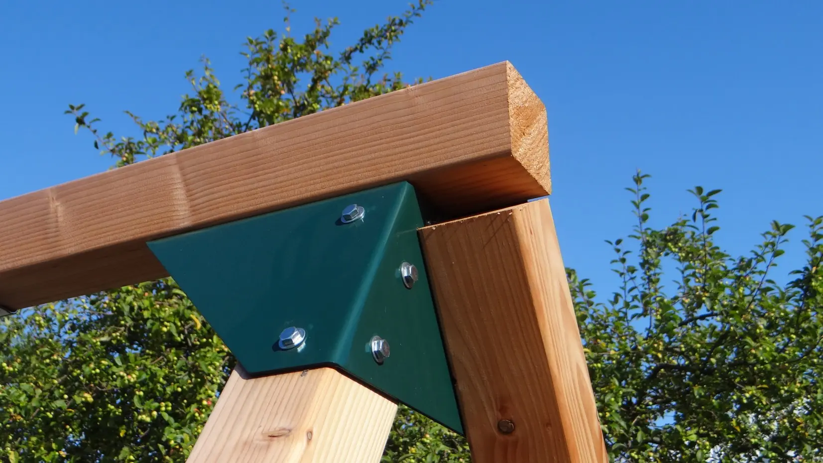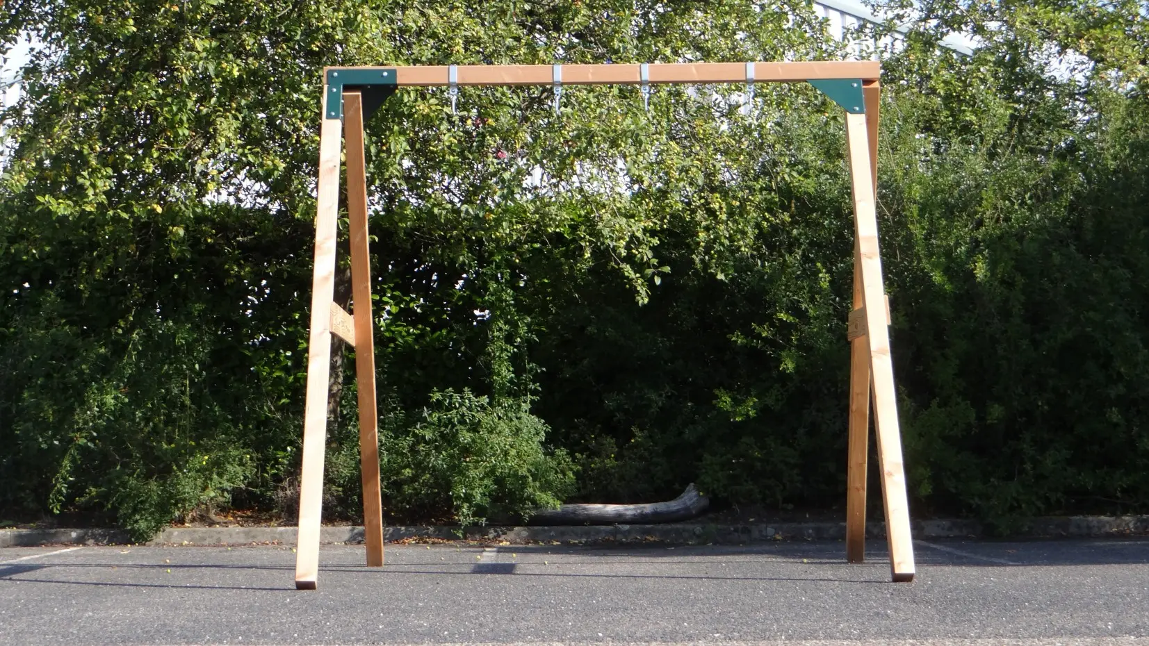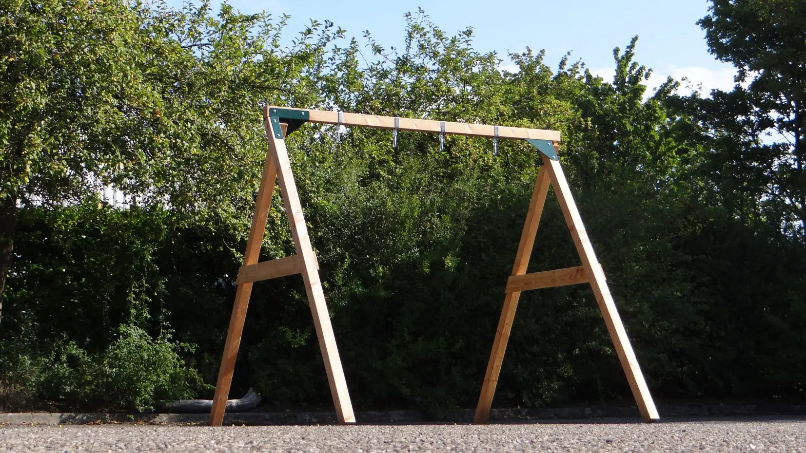 - De hoek tussen benen en ligger is haaks, waardoor de schommel weinig ruimte in beslag neemt en toch stevig is