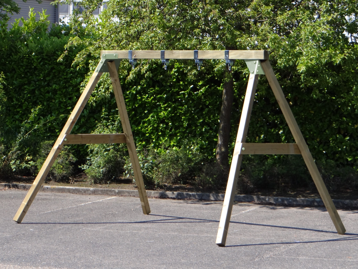Er is ruimte genoeg voor 2 schommelzitjes, of zelfs voor een grote schommelmand. De schommel wordt standaard geleverd met luxe marathon schommelhaken (of, indien gewenst met karabijnhaken).