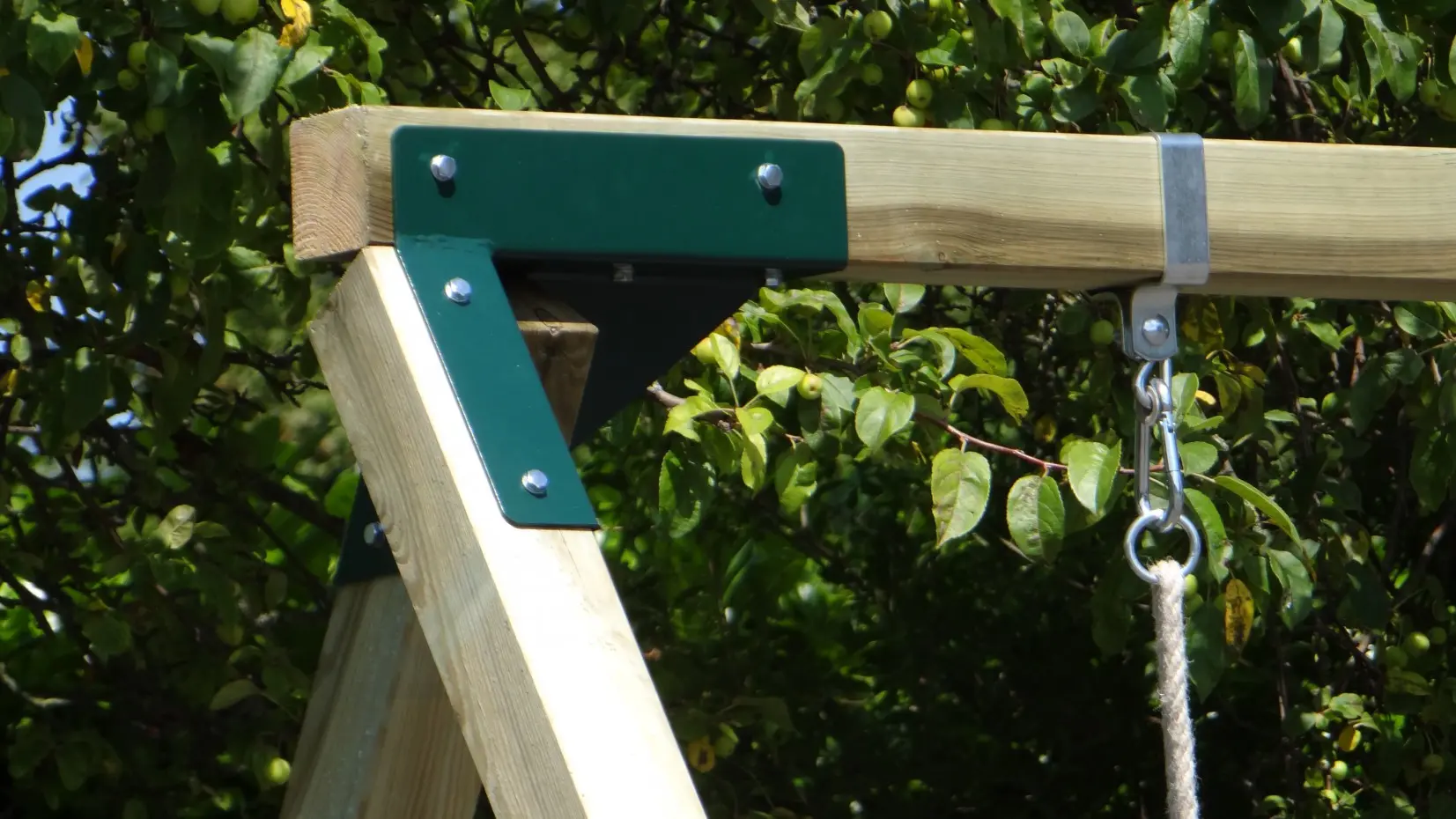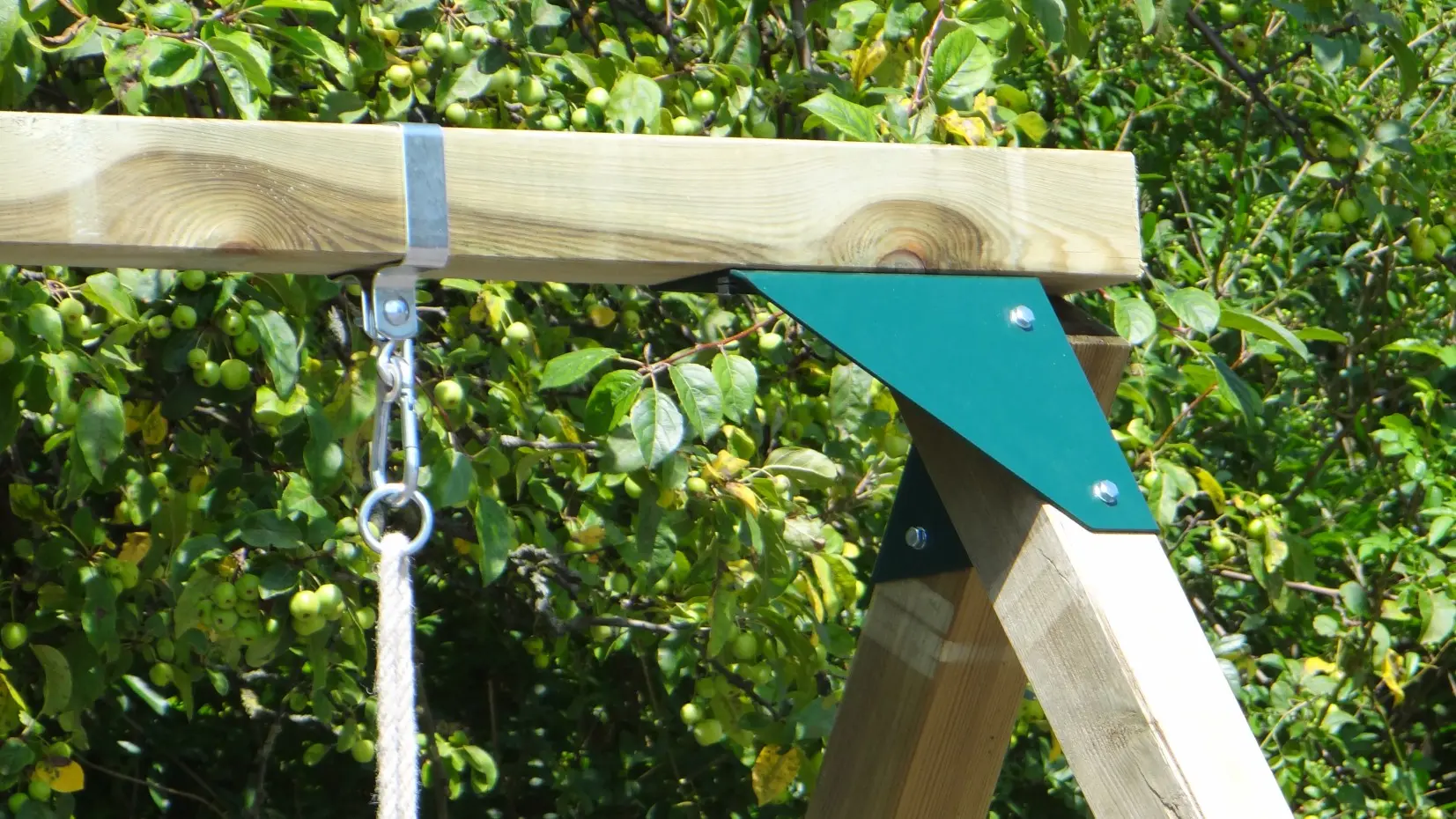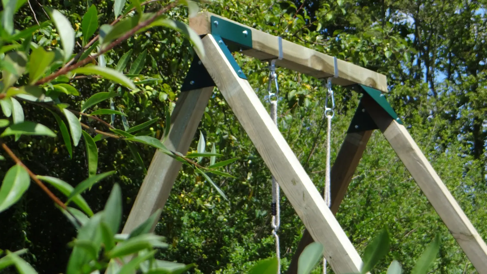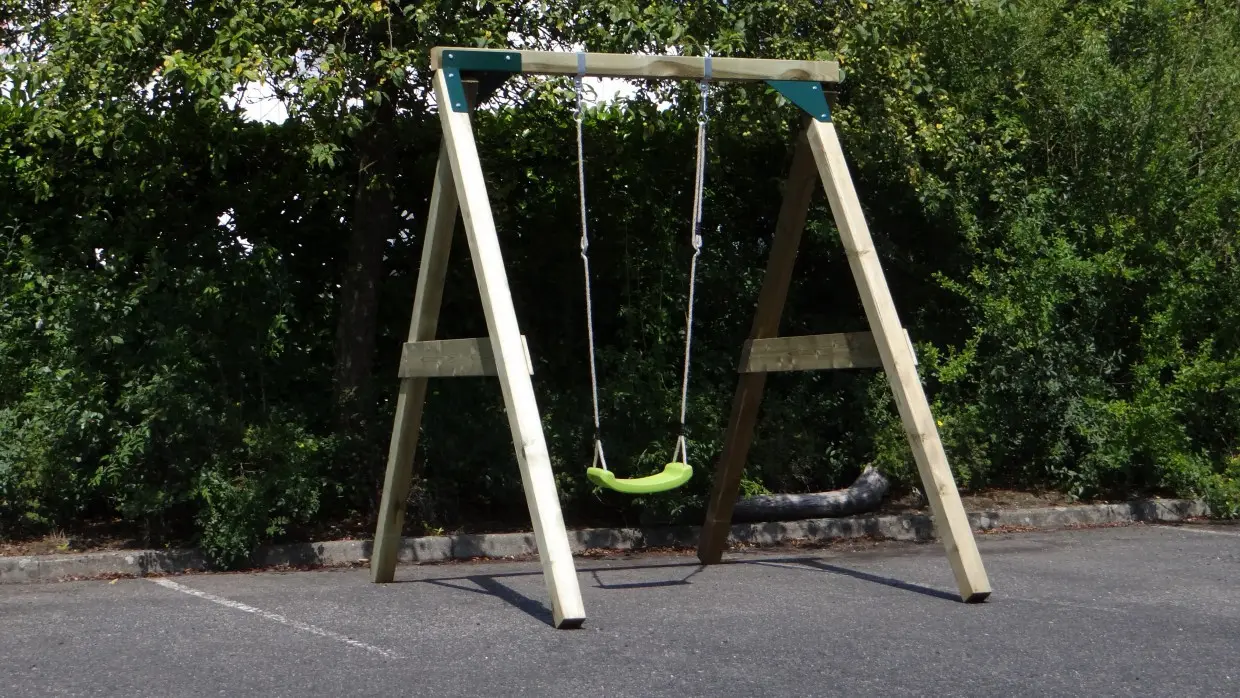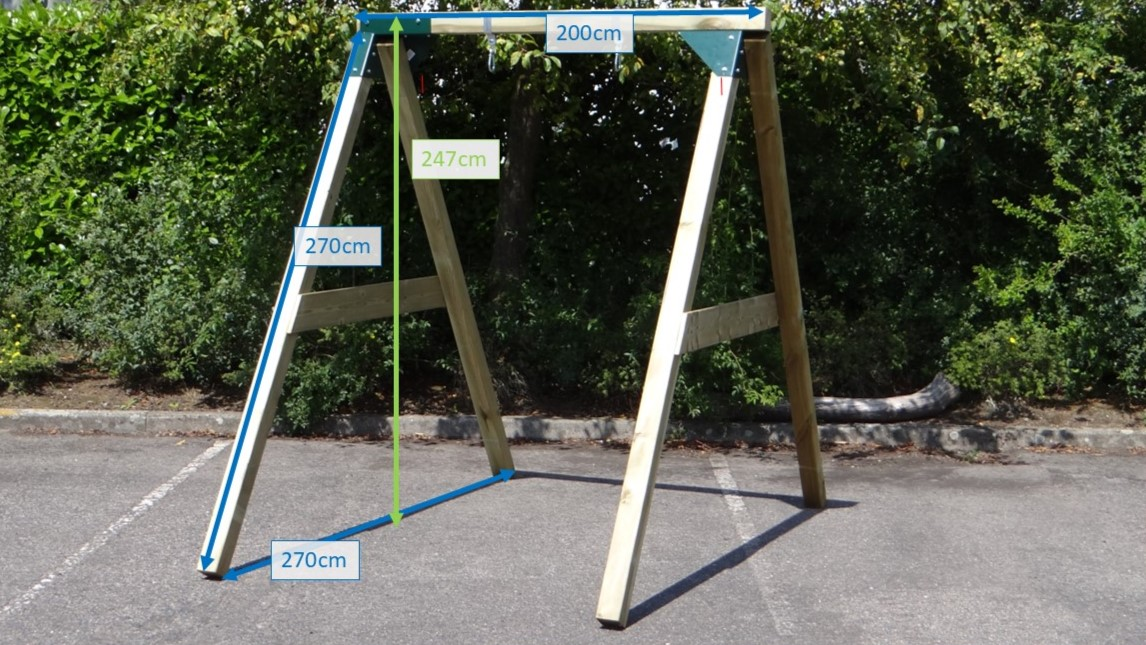 - De hoek tussen benen en ligger is haaks, waardoor de schommel weinig ruimte in beslag neemt en toch stevig is