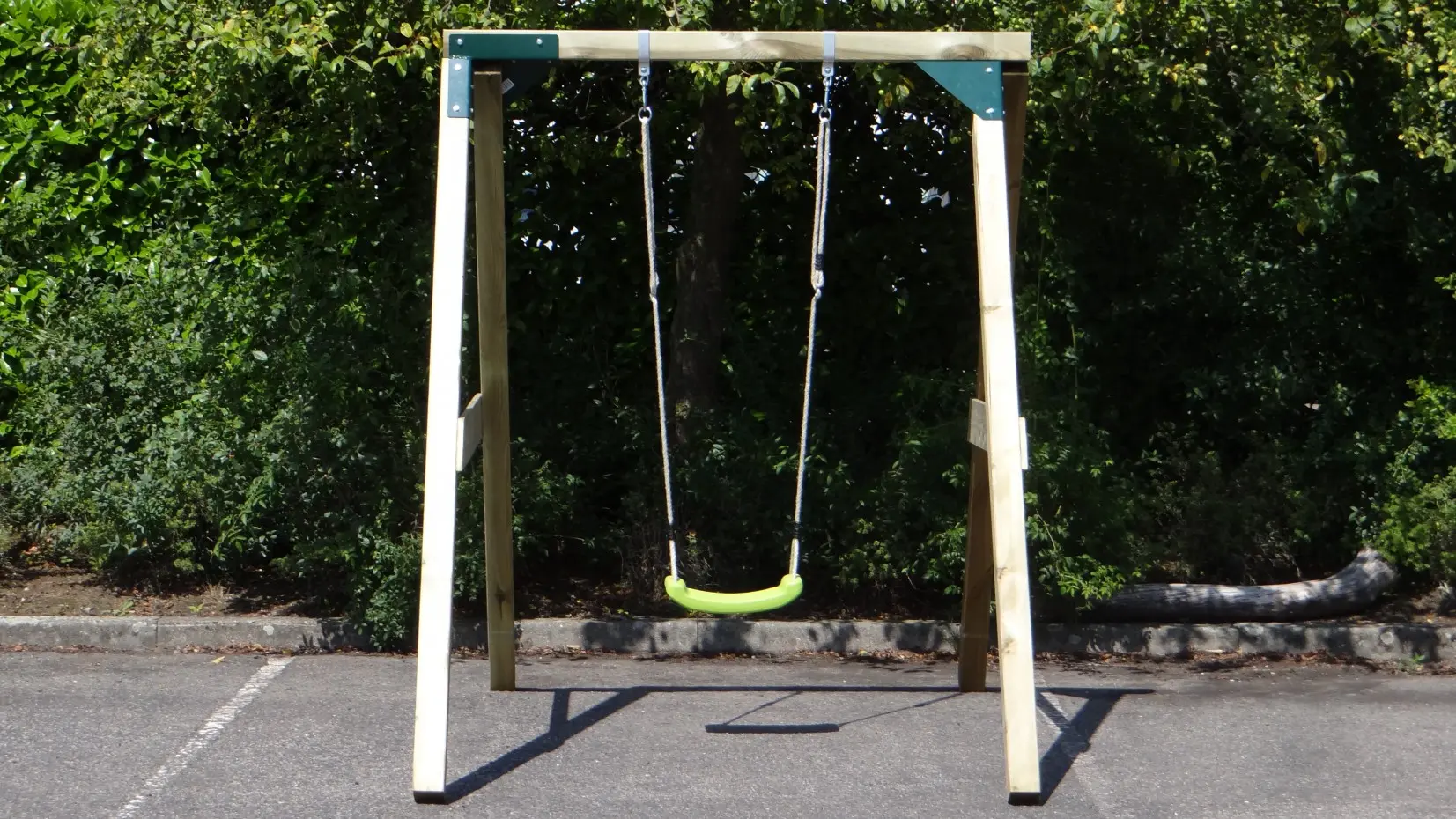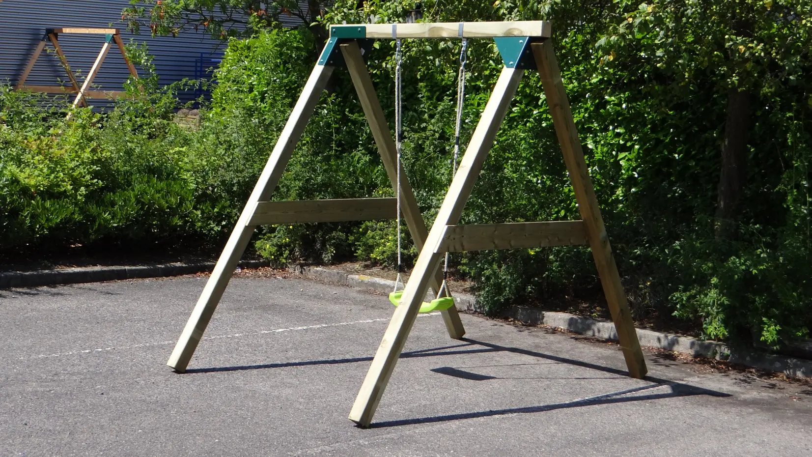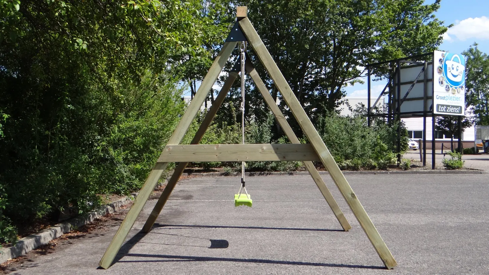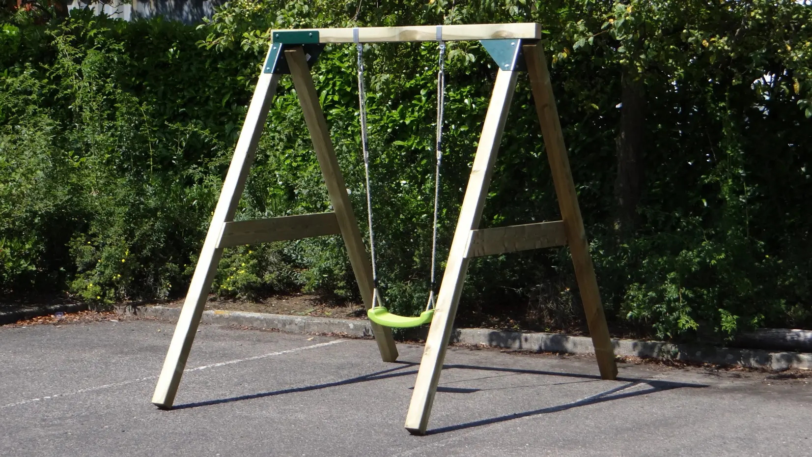 - De hoek tussen benen en ligger is haaks, waardoor de schommel weinig ruimte in beslag neemt en toch stevig is