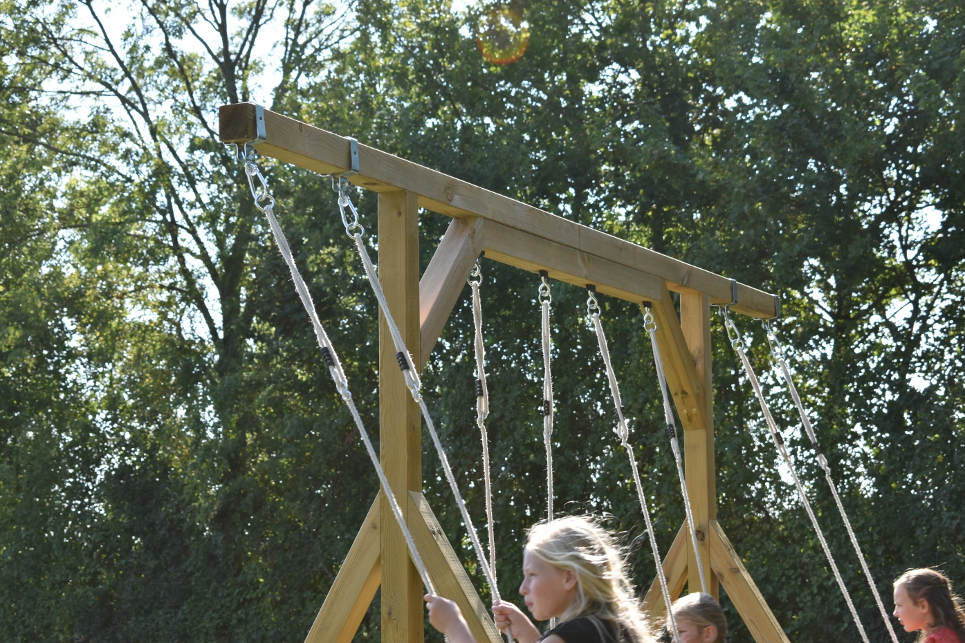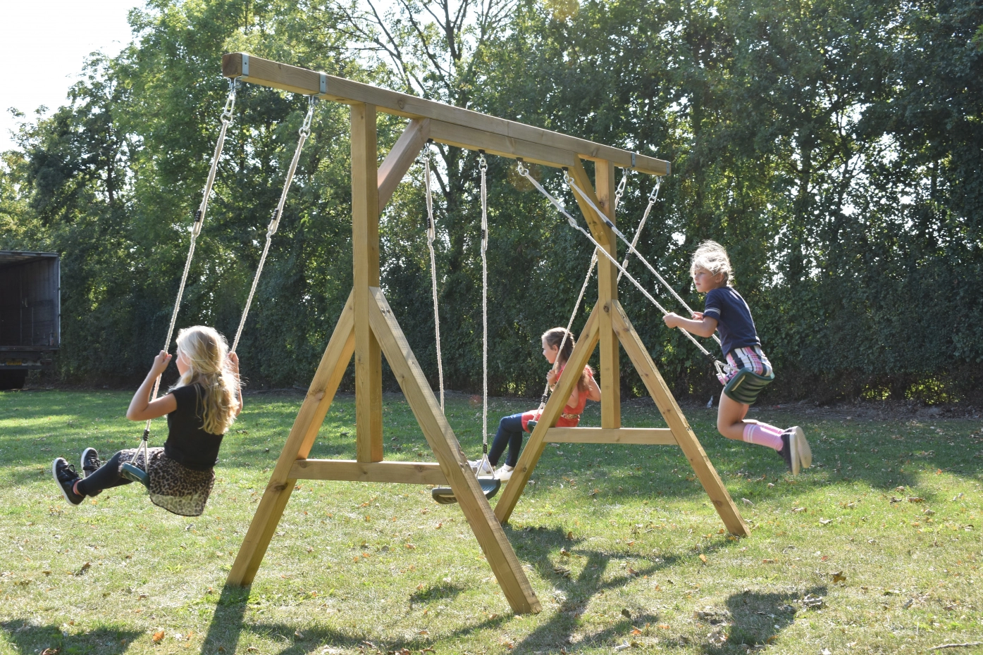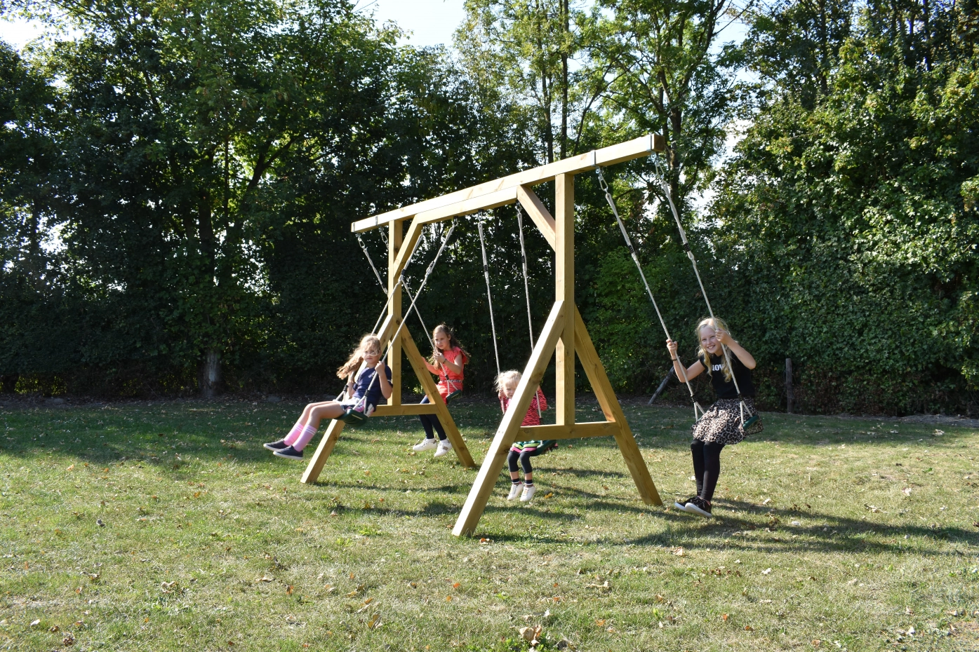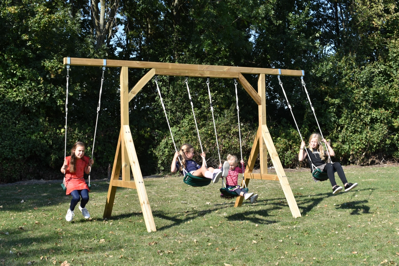 Familieschommel in eigen tuin? De Smart Quattro is een fantastisch grote schommel, waaraan 4 schommelzitjes tegelijk passen. Ruimte genoeg om heerlijk te schommelen, met broertjes en zusjes, of vriendjes en vriendinnetjes. De geïmpregneerd vurenhouten palen van deze gezinsschommel zijn bijna 9cm dik en kunnen dus wat hebben.
