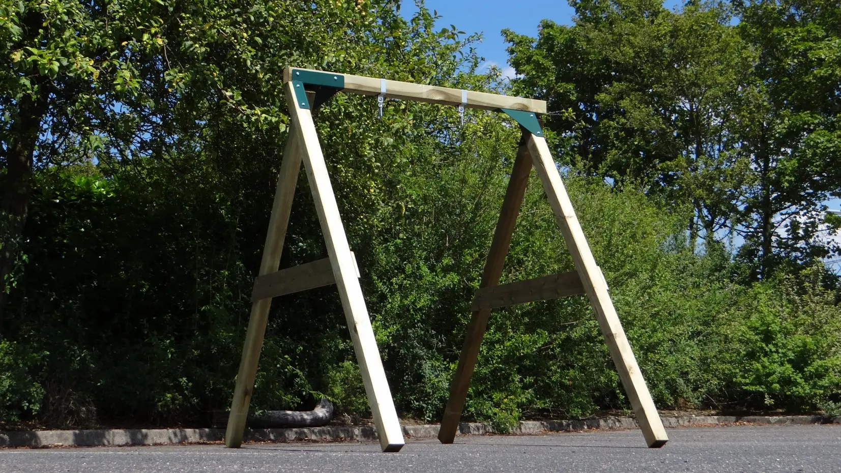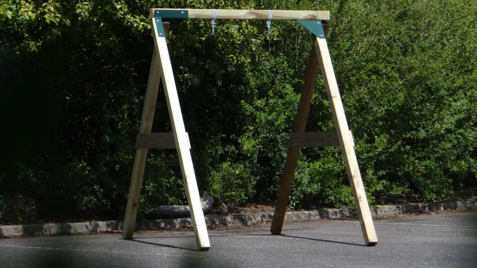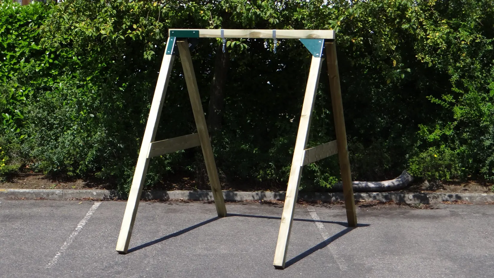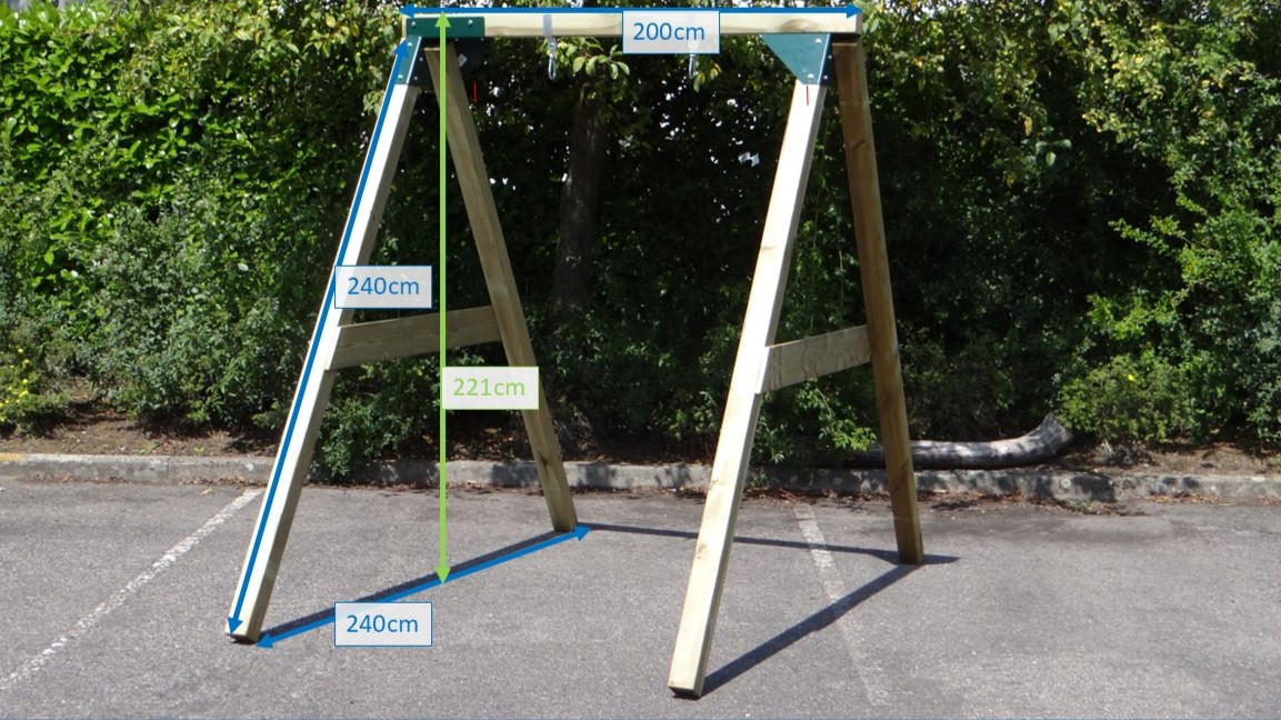 • De hoek tussen benen en ligger is haaks, waardoor de schommel weinig ruimte in beslag neemt en toch stevig is