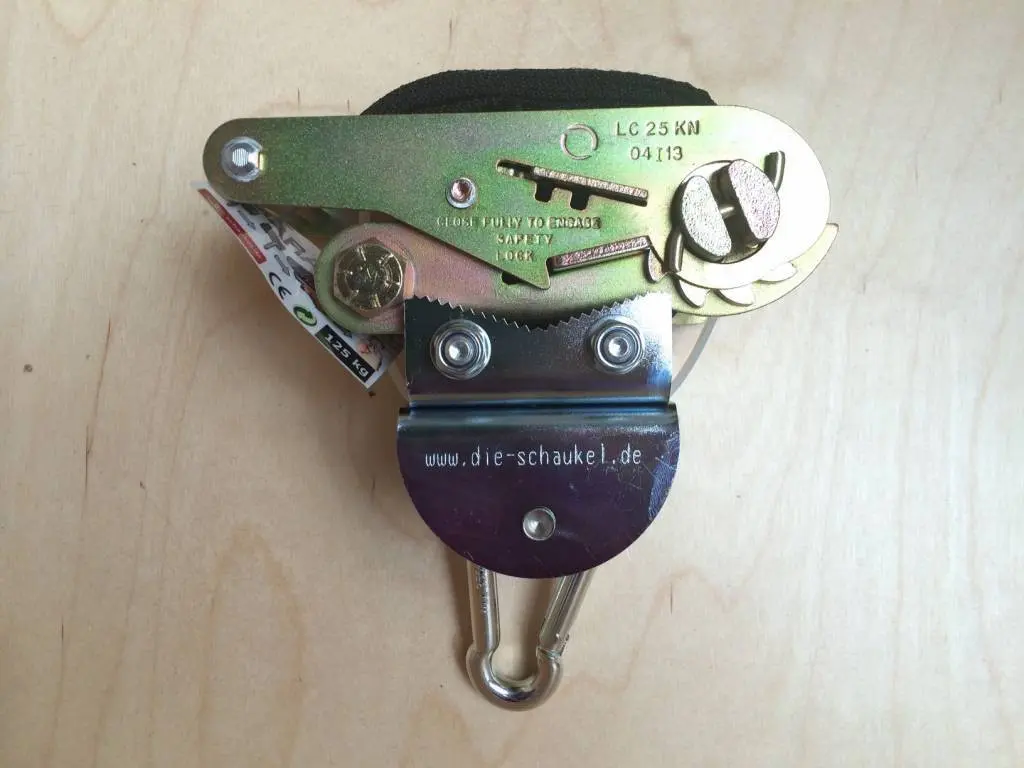 Deze schommelhaak is compleet met spanband met ratel, een bevestigingsplaatje voor de haak aan de beugel, de Marathonhaak met karabijn en het bevestigingsmateriaal.