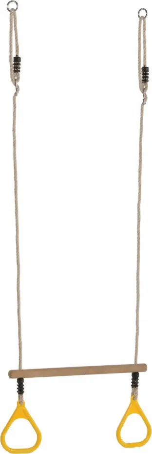 De ringtrapeze van KBT met ringen in kunststof is een leuk combinatieproduct. De hardhouten ringtrapeze is voorzien van kindvriendelijk PH-touw, wat niet in de handen brandt. De ringtrapeze is leverbaar in diverse kleuren.