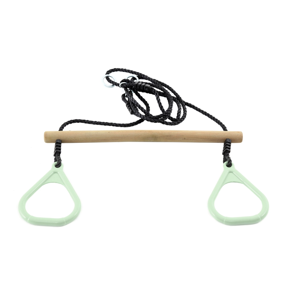 Deze houten trapeze is voorzien van lichtgroene ringen. De zwarte touwen zijn voorzien van metalen bevestigingen. De touwen kunnen versteld worden van 65-110cm. De trapeze is CE-gemarkeerd en EN-71 goedgekeurd.