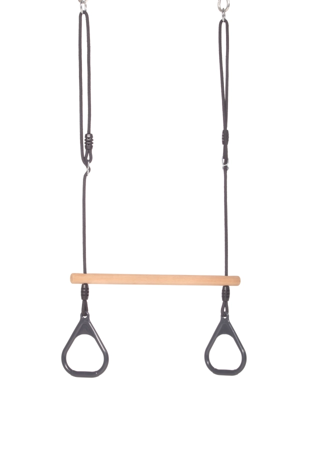 De houten ringtrapeze is voorzien van kunststof ringen in de kleur antraciet. Doe allerlei kunstjes op de ringen en trapeze. De ringtrapeze staat garant voor veel speelplezier!