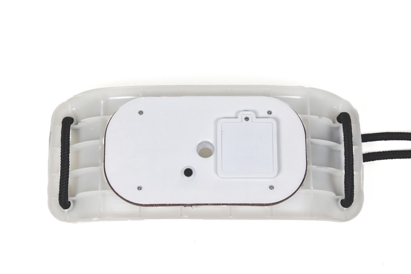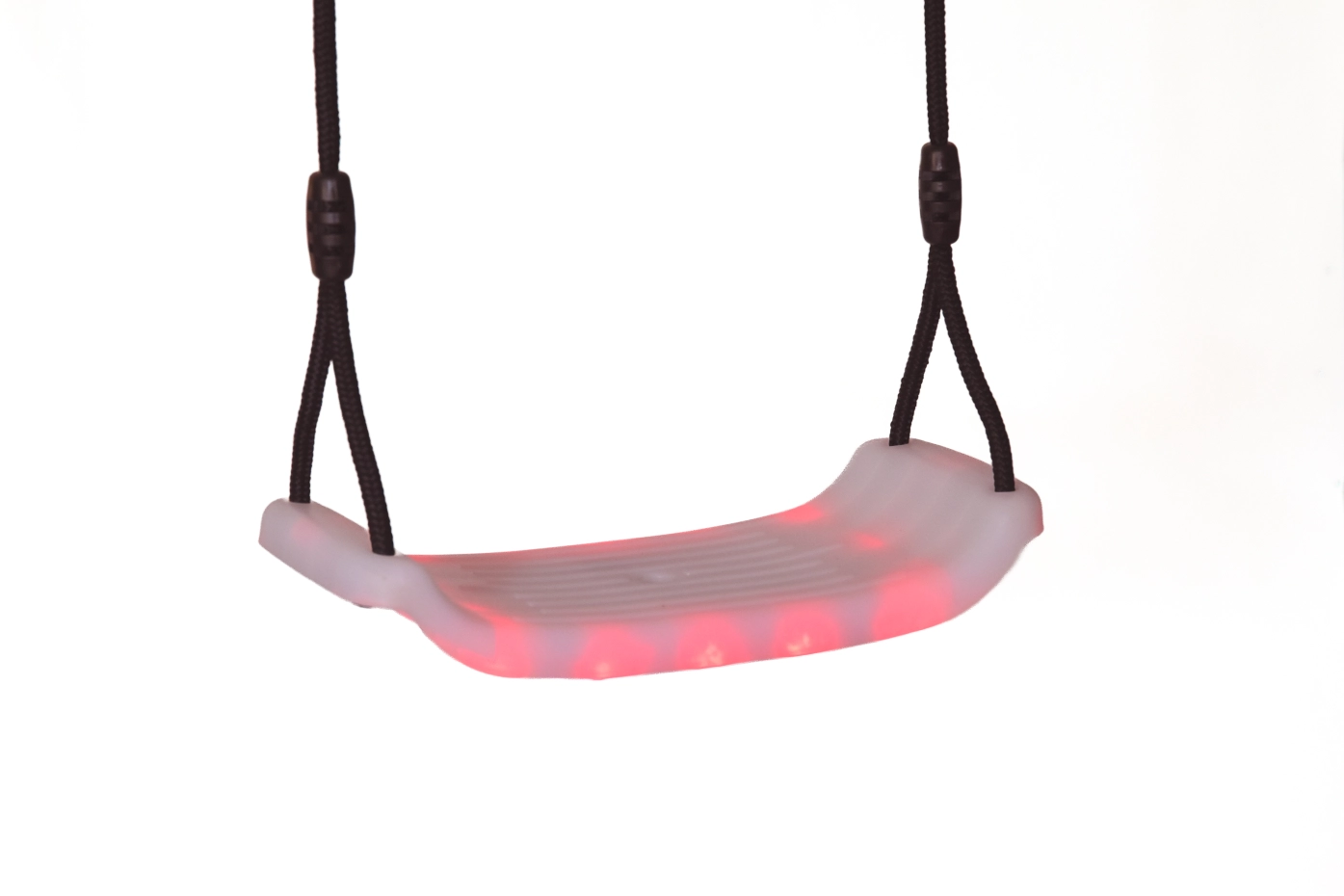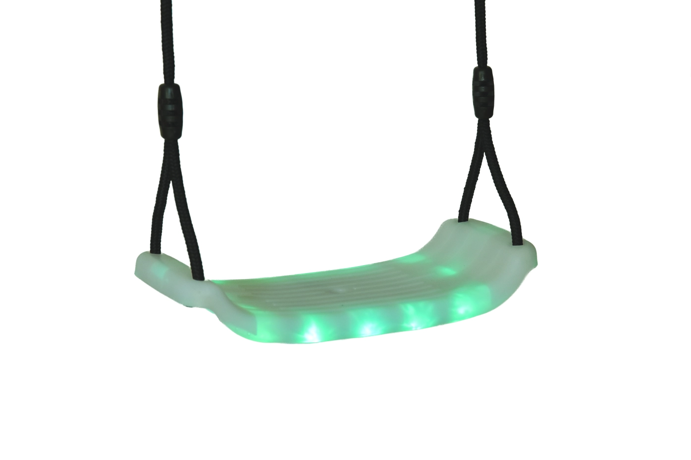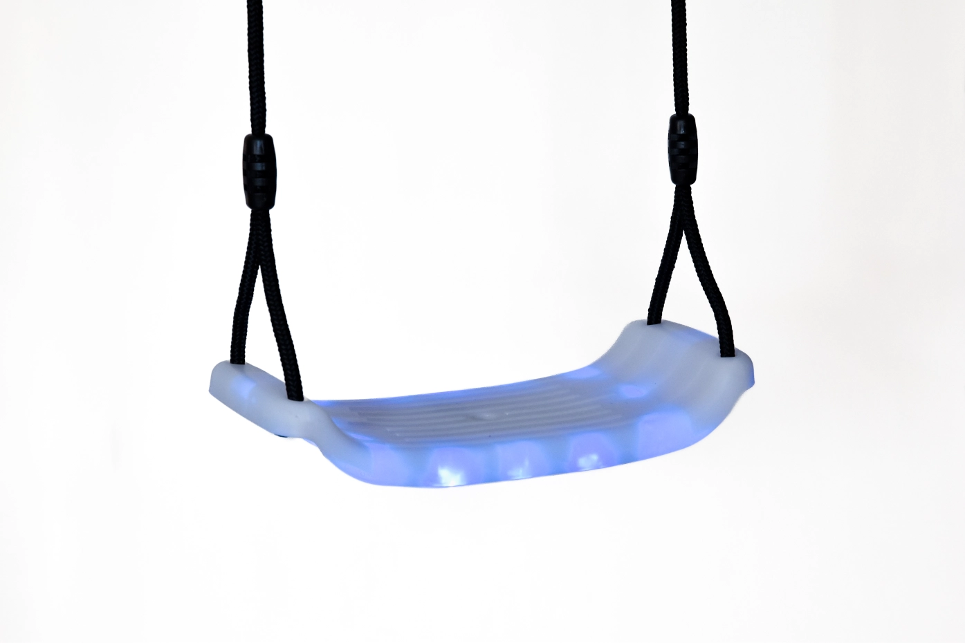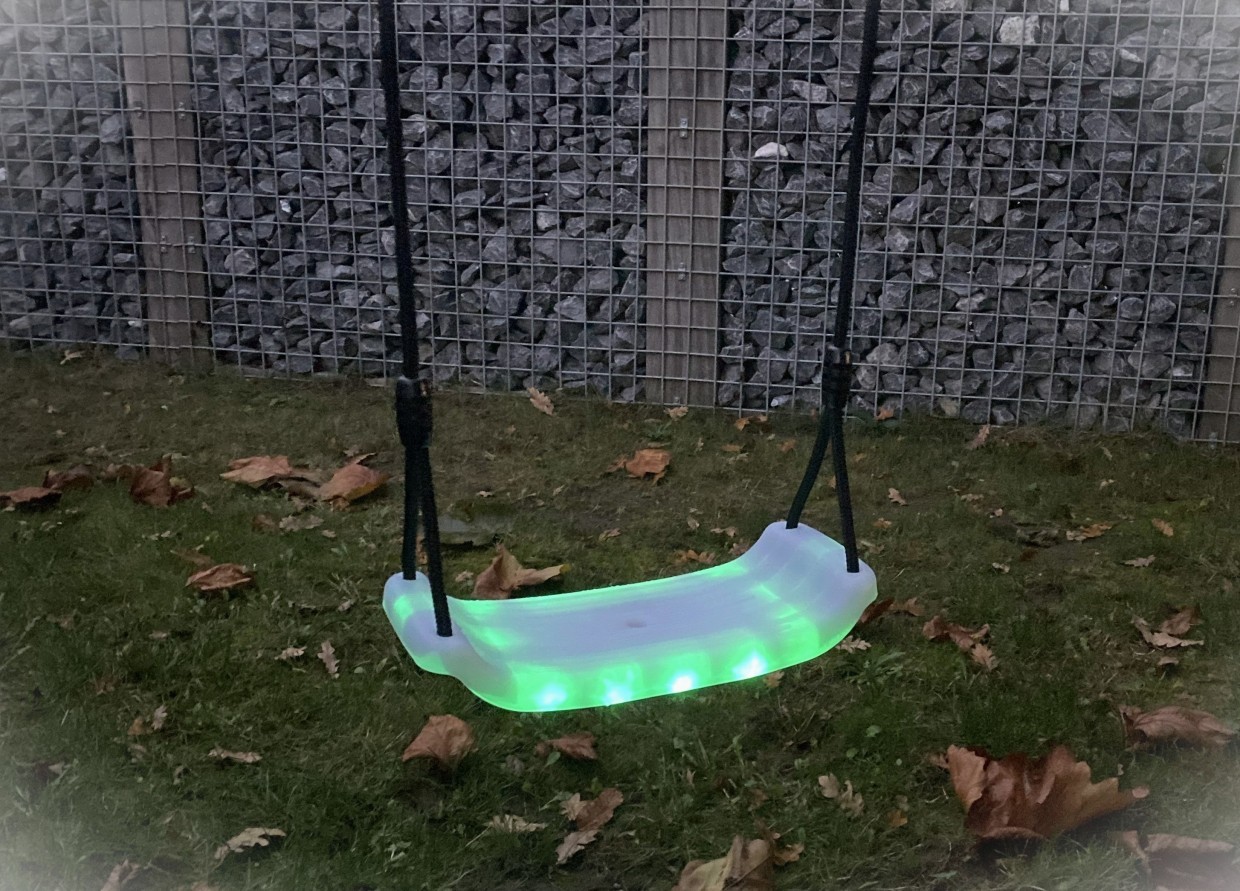 Schommelzitje met ingebouwde LED-verlichting in rood, groen, blauw of een afwisselende kleurmodus. De witte schommelzit met LED is stevig en vormvast en wordt geleverd met in lengte verstelbare, zwarte touwen en bevestigingsogen, zodat het eenvoudig kan worden opgehangen aan de schommel. Geschikt voor kinderen tot 50kg. Werkt op 4 AA-batterijen (niet inbegrepen). Afmeting zitting: ca. 40x17cm. Dit schommelzitje met verlichting is geschikt voor schommels waarvan de schommelbalk (onderkant) een hoogte heeft van ca. 190 - 240cm.