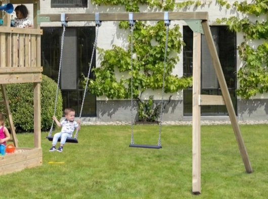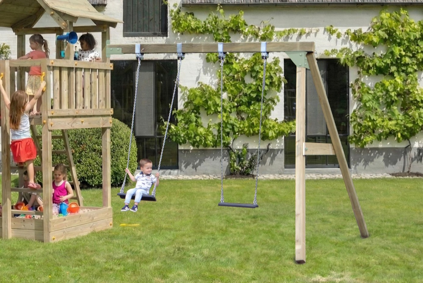 - De hoek tussen benen en ligger is haaks, waardoor de schommel weinig ruimte in beslag neemt en toch stevig is