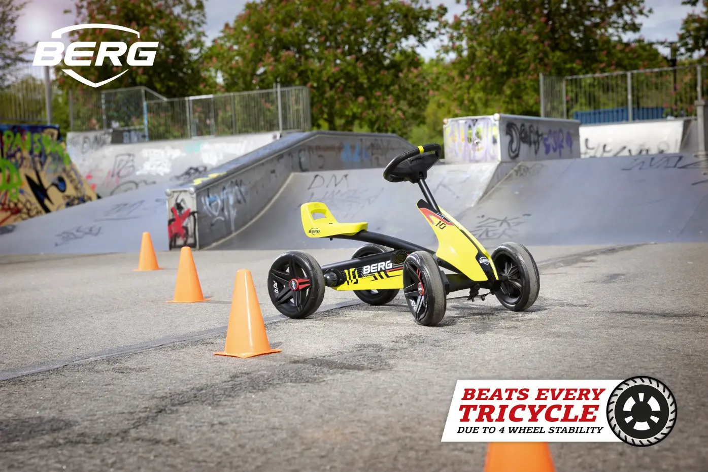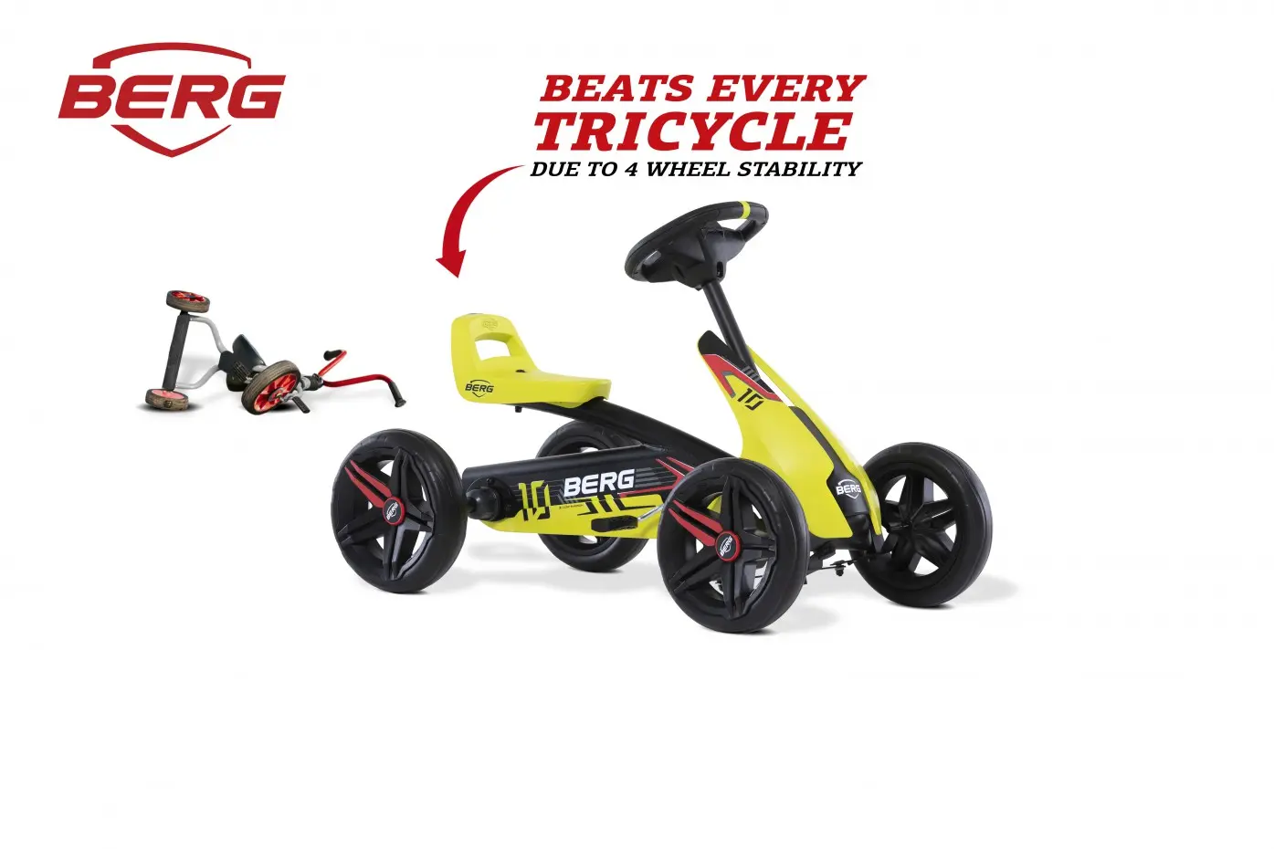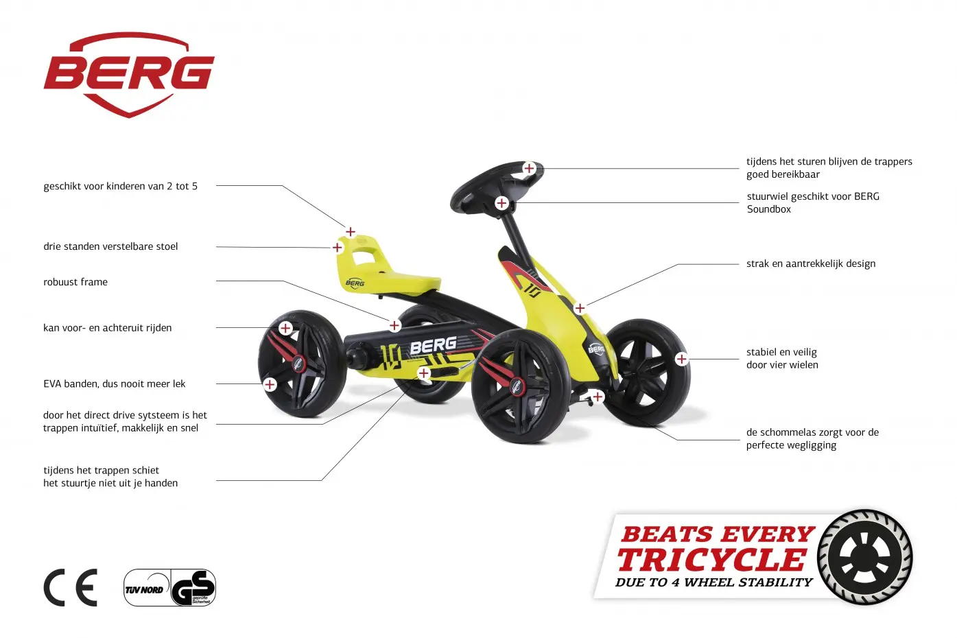 De eerste race-auto voor je kind is de skelter BERG Buzzy Aero! Deze gocart met stoere motorkap, robuust frame en snelle race-banden garandeert een échte race-ervaring. De 4 EVA banden van de skelter Aero zorgen dat deze racer super stabiel door de scherpste bochten kan. Op de Aero kunnen kinderen vooruit rijden, achteruit rijden en makkelijk remmen!