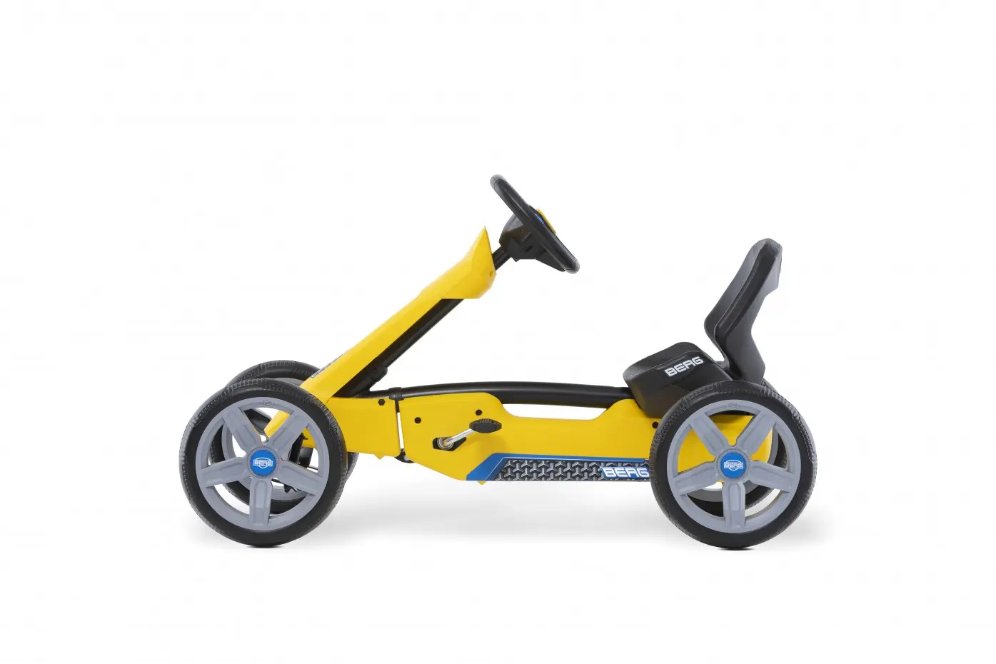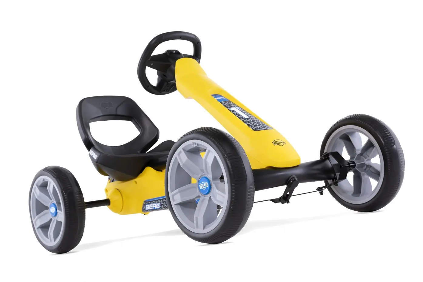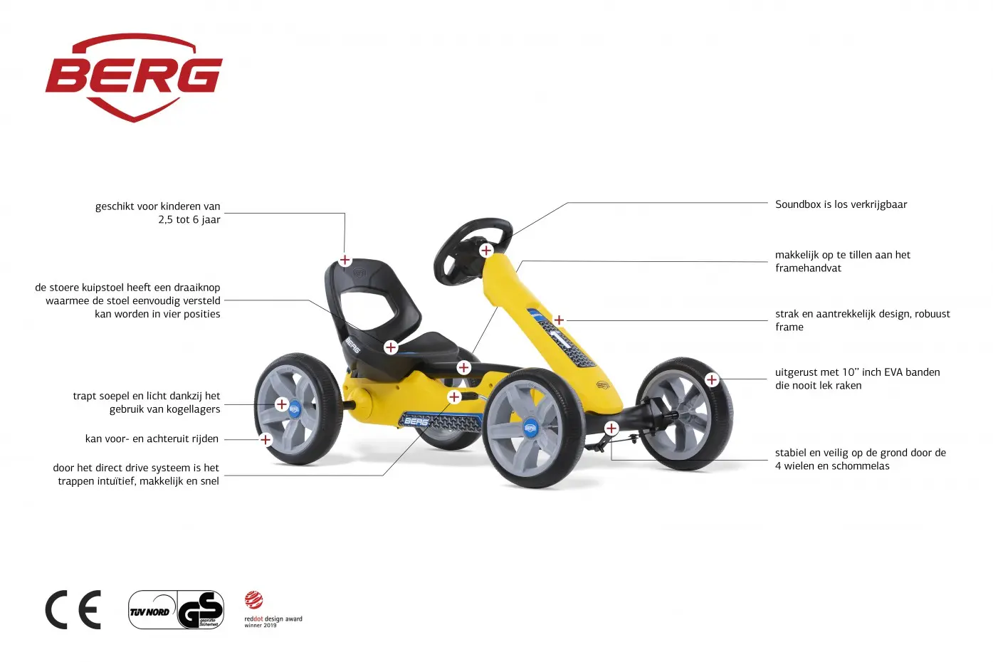 Door het aantrekkelijke en sportieve design van de Reppy Rider, wil elk kind de buurt hier wel op ontdekken. Het opvallende sportstuur, de nooit lek rakende EVA 10'' inch banden, de stoere kuipstoel en de schommel-as maken skelterrijden ongekend leuk. De BERG Reppy is door de lage kuipstoel de eerste skelter voor jonge kinderen met échte, lage skelterinstap.