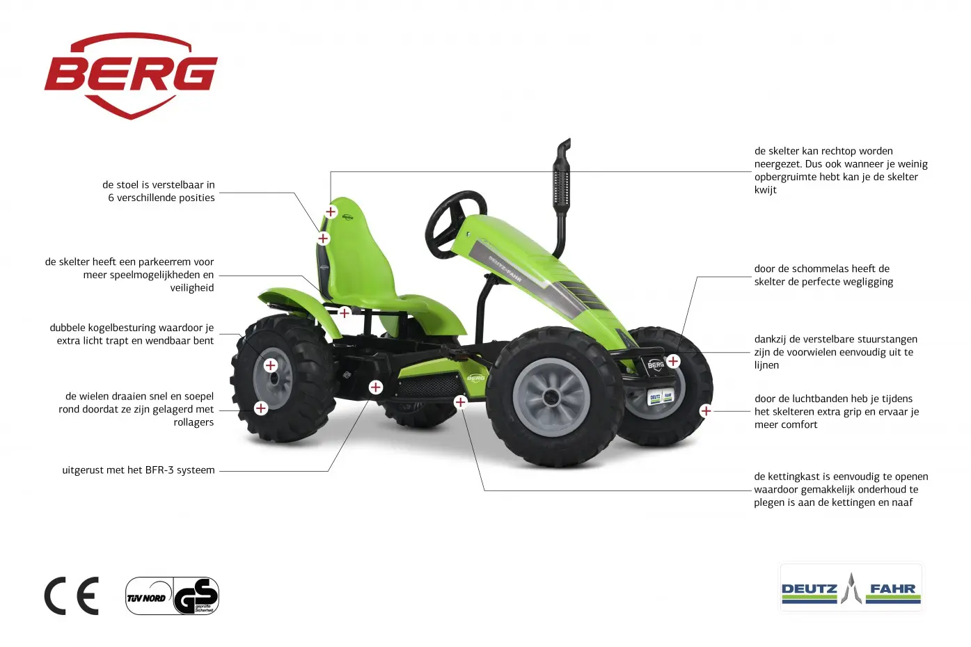• BERG biedt veel accessoires aan waarmee je het speelplezier nog meer uitgebreid kan worden. Denk aan een duostoel, een kar, een voor- of achterhef inrichting, zwaailichten en nog veel meer!