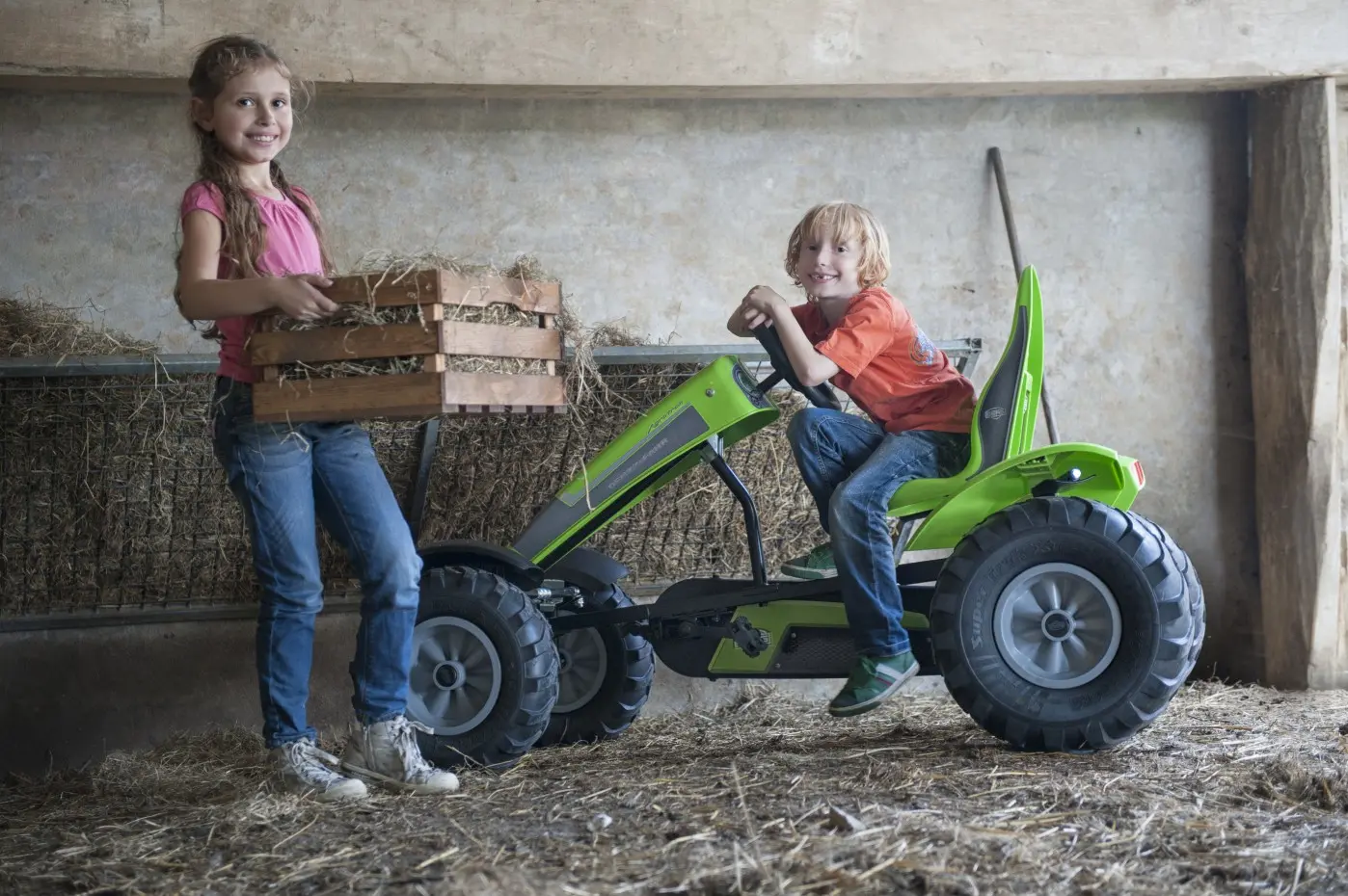 Eindeloos spelen met je vriendjes of vriendinnetjes of met je skelter klusjes doen. Het kan allemaal met de opvallende BERG Deutz Fahr BFR-3. Een stoere, zeer complete skelter die niet van de echte Deutz Fahr tractor te onderscheiden is. Deze skelter heeft 3 versnellingen, zodat je nog lichter trapt en nog sneller door de modderplassen scheurt.