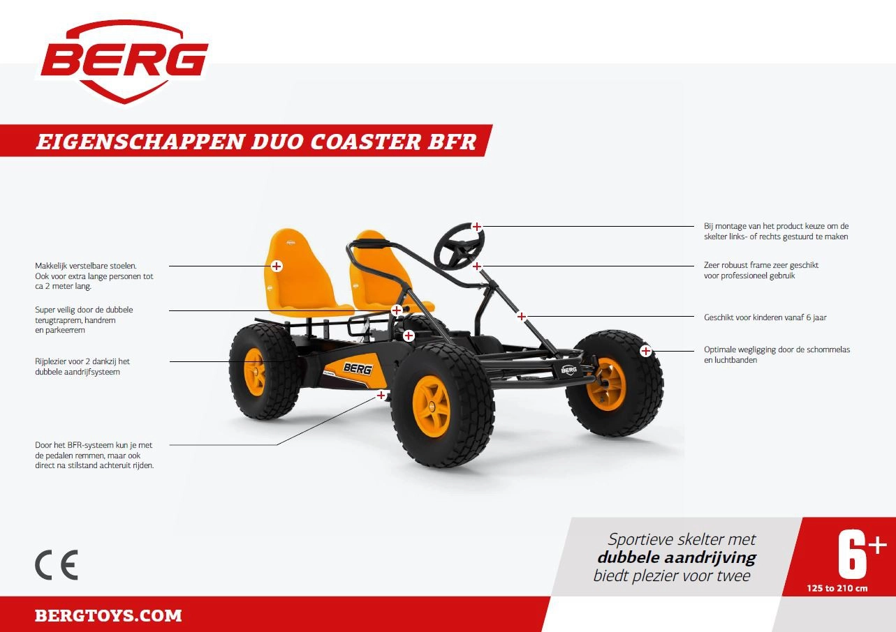 De BERG Duo Coaster is de nieuwe tweepersoonsskelter speciaal ontwikkeld voor de verhuurmarkt. De skelter biedt een geweldige rijervaring door het lage gewicht en de dubbele aandrijving. Dankzij het BFR aandrijfsysteem kan de gebruiker door eenvoudig achteruit te trappen zowel remmen als achteruit rijden. Dit maakt het rijden extra veilig maar bovenal extra leuk!