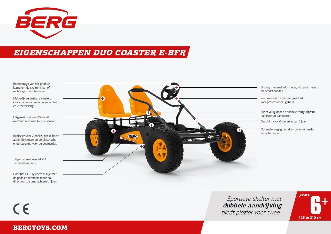 De BERG Duo Coaster is de nieuwe tweepersoonsskelter speciaal ontwikkeld voor de verhuurmarkt. De skelter biedt een geweldige rijervaring door het lage gewicht en de dubbele aandrijving. Dankzij het BFR aandrijfsysteem kan de gebruiker door eenvoudig achteruit te trappen zowel remmen als achteruit rijden. Dit maakt het rijden extra veilig maar bovenal extra leuk!