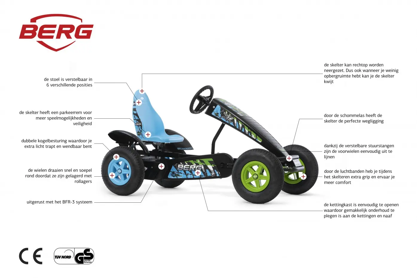 - BERG biedt veel accessoires aan waarmee je het speelplezier nog meer uitgebreid kan worden. Denk aan een duostoel, een kar, een voor- of achterhef inrichting, zwaailichten en nog veel meer!