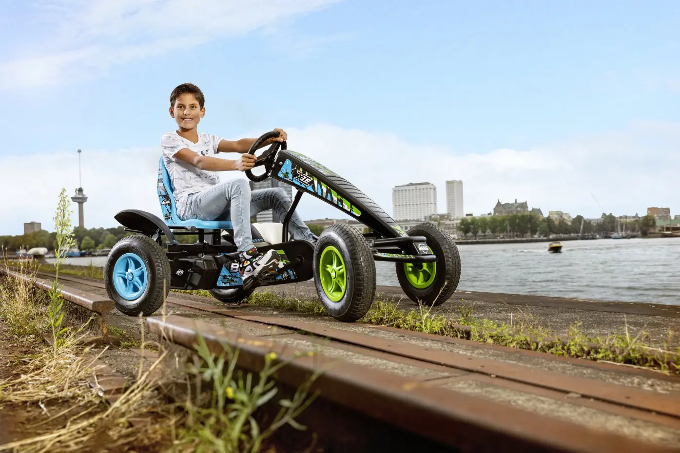 - Voor extra grip en meer comfort heeft deze skelter banden die met lucht gevuld zijn.
