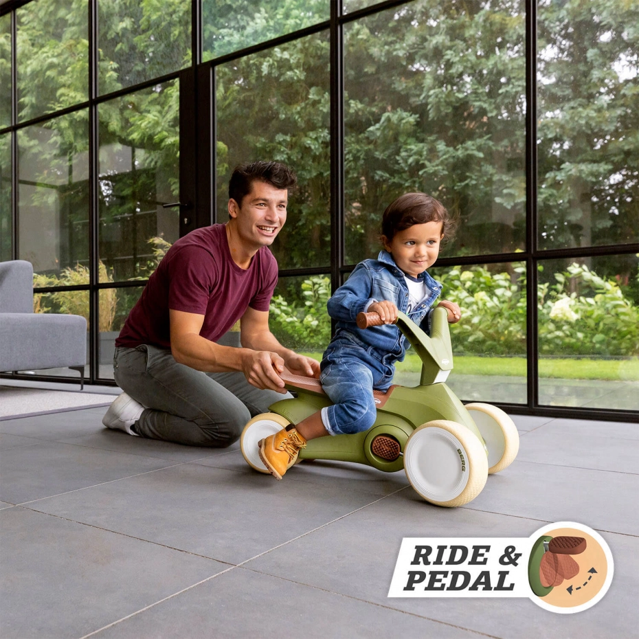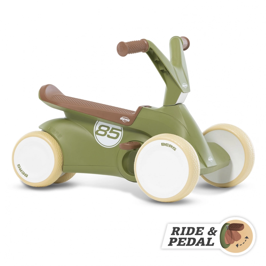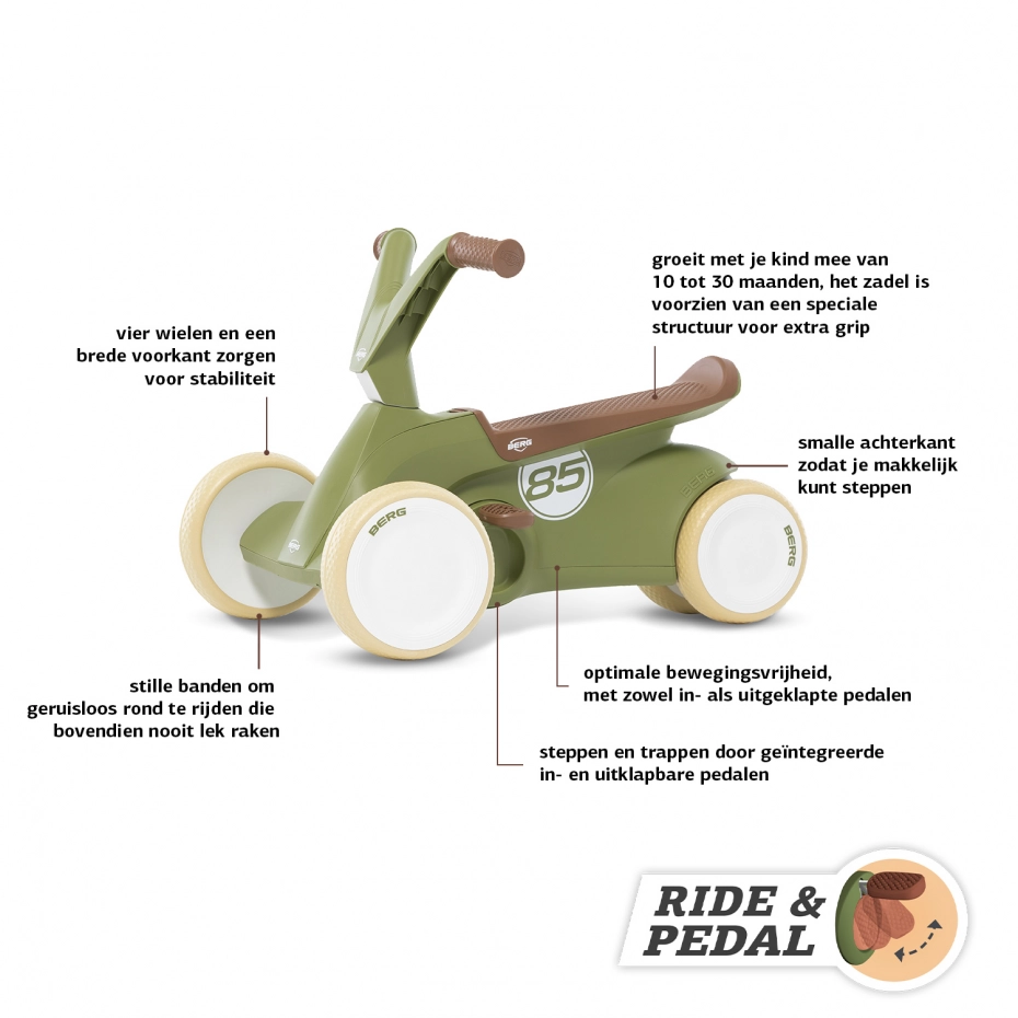 De BERG GO² is de kleinste skelter, geschikt voor kinderen van 10-30 maanden. Maar onderschat deze dreumes van een skelter niet. Op deze skelter leert je kleintje namelijk sneller steppen en trappen! Kortom 2 in 1. Eerst kun je de trappers ingeklapt houden zodat je kindje kan steppen. Door de vormgeving kan je kindje de BERG GO² eenvoudig als loopauto gebruiken zonder dat de pedalen of achterwielen in de weg zitten. Wanneer je kind toe is aan de volgende fase, klap je de trappers uit. Dan kan jouw dreumes heerlijk leren rondrijden op de BERG GO². Je hoeft niet bang te zijn dat je kindje omvalt, want de BERG GO² staat stevig op de grond door de vier wielen. Dit is wel zo veilig!