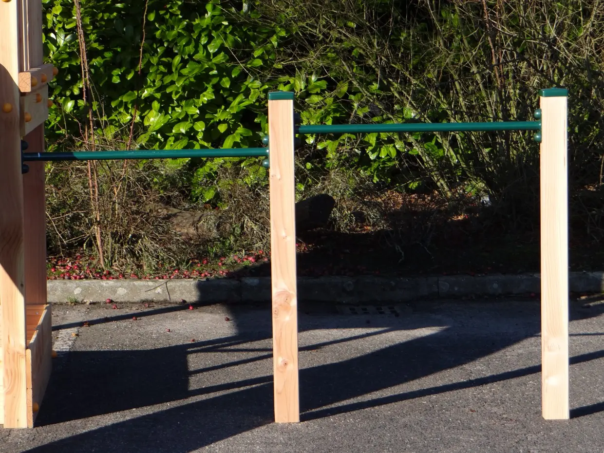 Dubbele duikelstang 125cm met 2 houten palen. Dubbel tuimelrek voor dubbel speelplezier!! Totale breedte 268cm. Ook is deze goed te combineren met een speeltoestel.