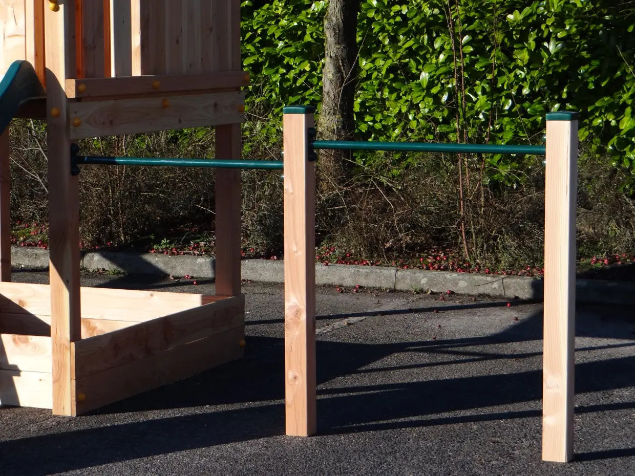 Stevig duikelrek wat gebruikt kan worden als aanbouw-duikelrek tegenaan een speeltoestel of muur. Het duikelrek bestaat uit 2 groene duikelstangen: 1 duikelstang van 90cm lang en 1 van 125cm. En 2 douglas houten palen met een lengte van ca. 240cm.