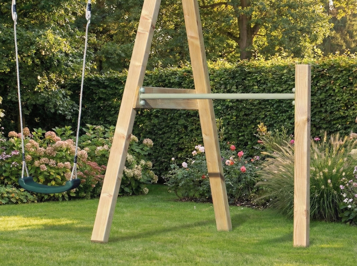 Duikelrek met 1 paal als uitbreiding aan het speeltoestel of bevestiging aan de muur. Het aanbouw duikelrek is voorzien van een 125cm lange pastelgroene gepoedercoate duikelstang en een geïmpregneerd vurenhouten paal.