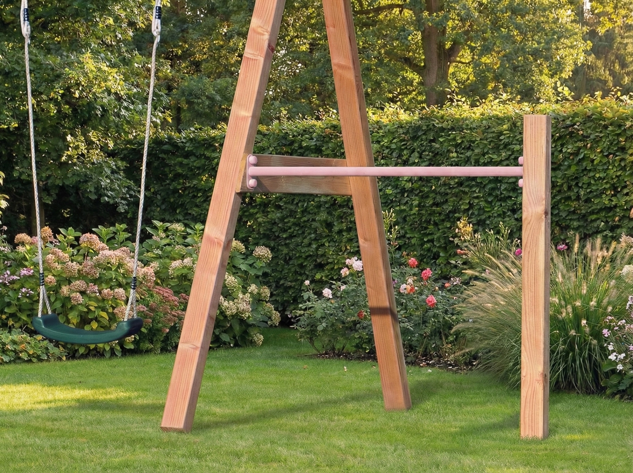 Duikelrek met 1 paal als uitbreiding aan het speeltoestel of bevestiging aan de muur. Het duikelrek is voorzien van een 125cm lange pastelroze gepoedercoate duikelstang.