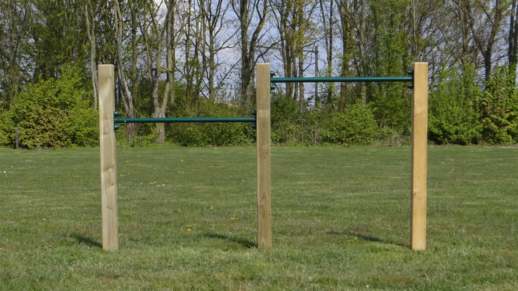 Dubbel turnrek met 2 groene duikelstangen. De ene duikelstang heeft een lengte van 90cm, de andere duikelstang heeft een lengte van 125cm. De duikelstangen zijn van gepoedercoat metaal. De 3 palen zijn van geïmpregneerd grenenhout. Een turnrek in de tuin wordt heel erg gewaardeerd. Gratis verzending.