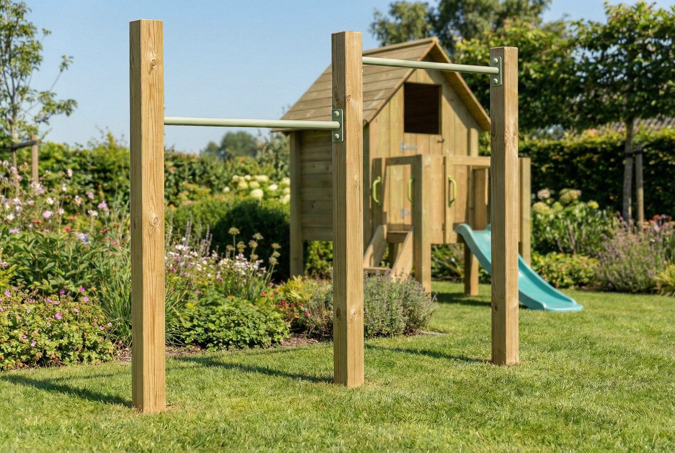 Dit duikelrek is uitgerust met twee duikelstangen van 90 cm en drie palen van 2,4 meter, gemaakt van geïmpregneerd vurenhout. De pastelgroen gepoedercoate duikelstangen zorgen voor een speelse uitstraling en duurzaam gebruik.