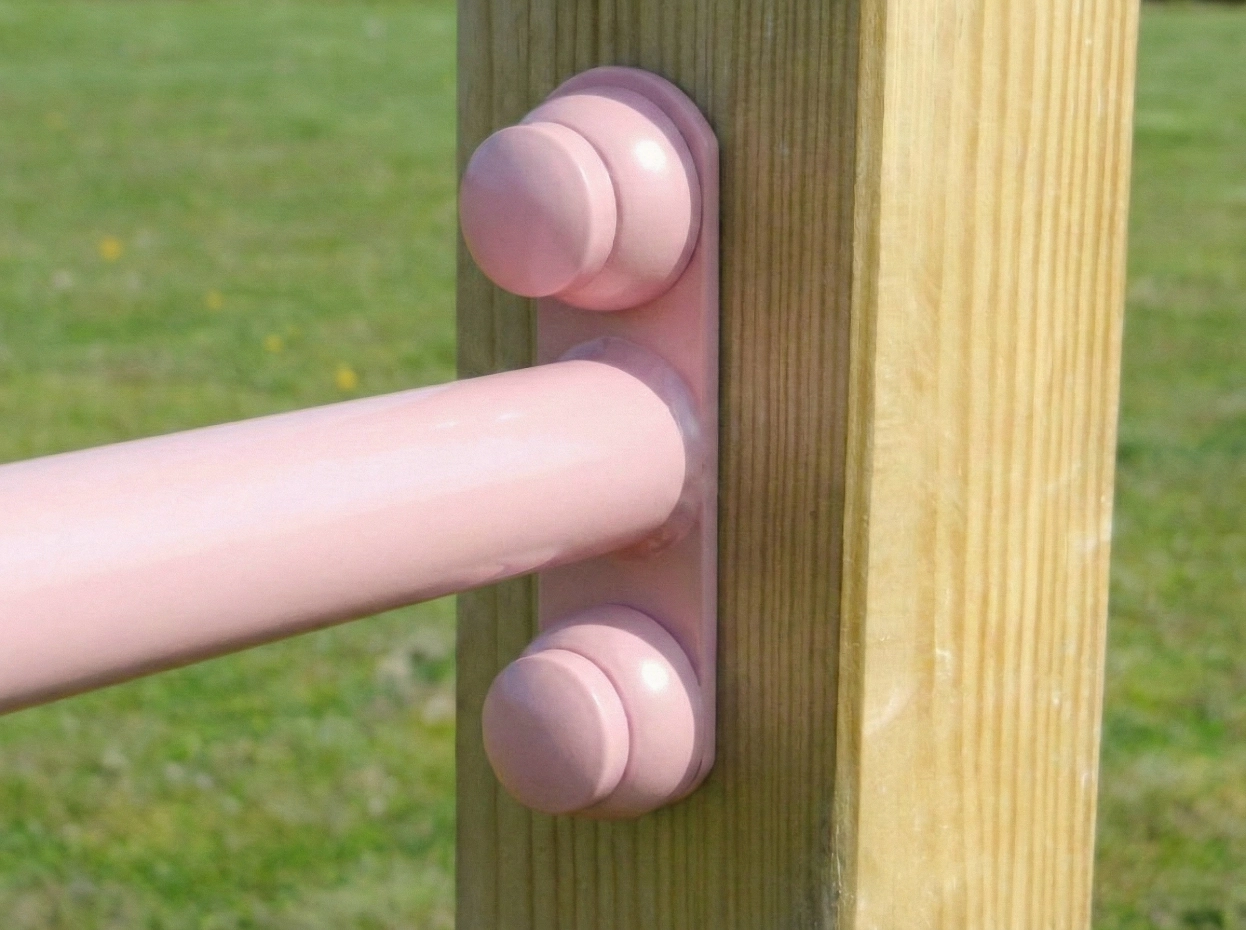 Dubbel duikelrek voor twee personen met twee duikelstangen van 90 cm. Voorzien van drie stevige palen van geïmpregneerd vurenhout en duikelstangen van pastelroze gepoedercoat staal voor extra speelplezier.
