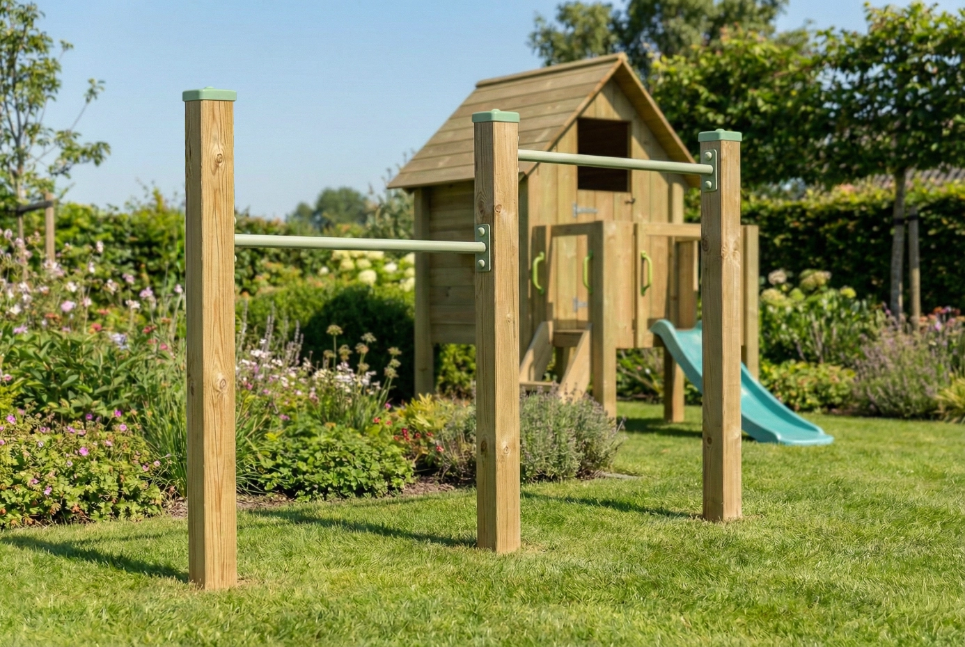 Prachtig dubbel duikelrek met 2 duikelstangen van 90cm en 3 houten palen van 1,9 meter. De metalen duikelstangen zijn pastelgroen gepoedercoat. Een heel stevig duikelrek wat geleverd wordt incl. bevestigingsmateriaal. Dubbel duikelrek voor dubbel speelplezier!!