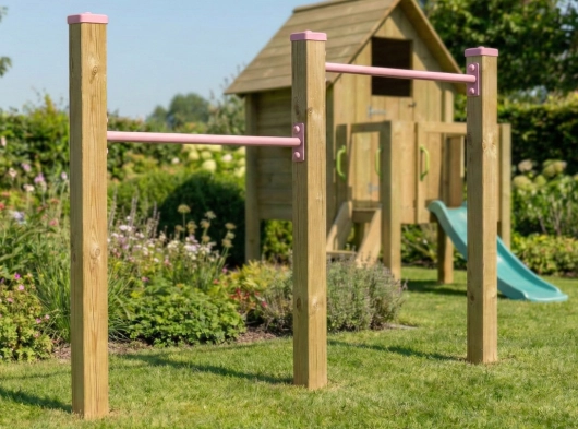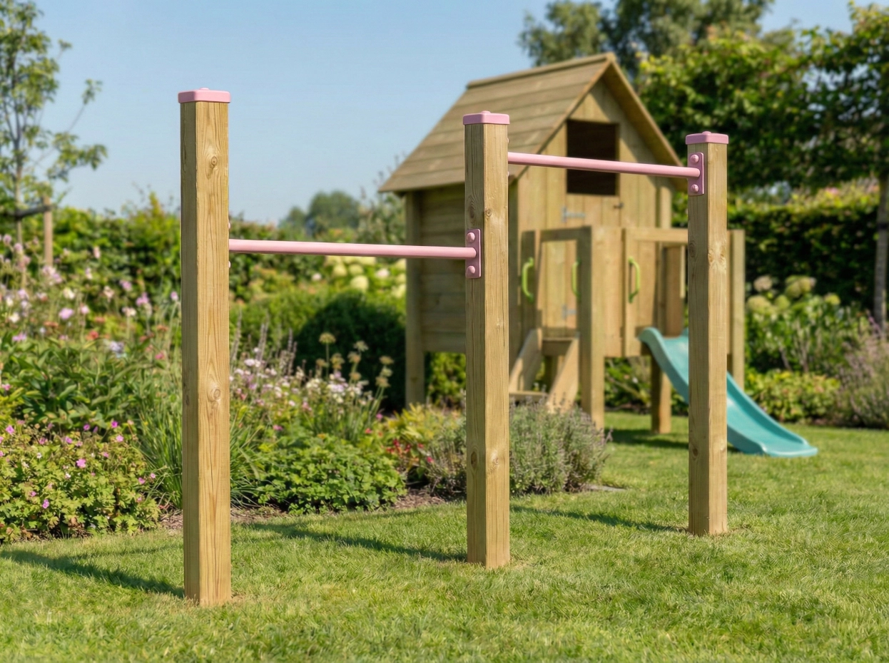 Prachtig dubbel duikelrek met 2 duikelstangen van 90cm en 3 houten palen van 2 meter. De metalen duikelstangen zijn pastelroze gepoedercoat. Een heel stevig duikelrek wat geleverd wordt incl. bevestigingsmateriaal. De geïmpregneerd vurenhouten palen zijn voorzien van mooie pastelroze afdekkapjes.