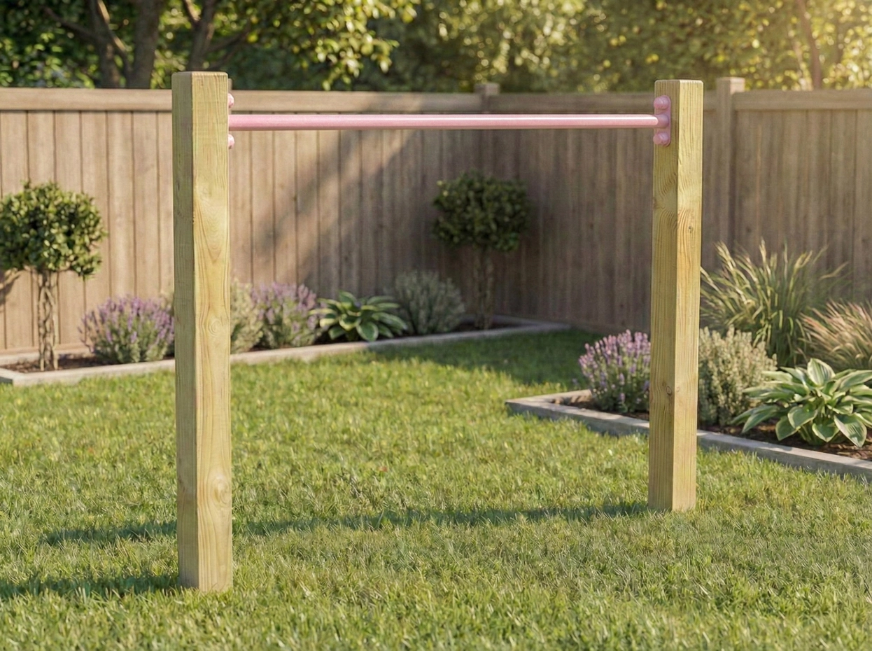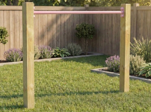 Duikelrek met stalen duikelstang van 125cm. Dit duikelrek is een prachtige speelattractie voor in uw eigen tuin. Het duikelrek heeft een pastelroze gepoedercoate duikelstang van staal en twee geïmpregneerd houten palen van 2 meter lang. Een duikelrek neemt weinig ruimte in beslag en is daardoor al snel geschikt als buitenspeelgoed voor in de kleine tuin.