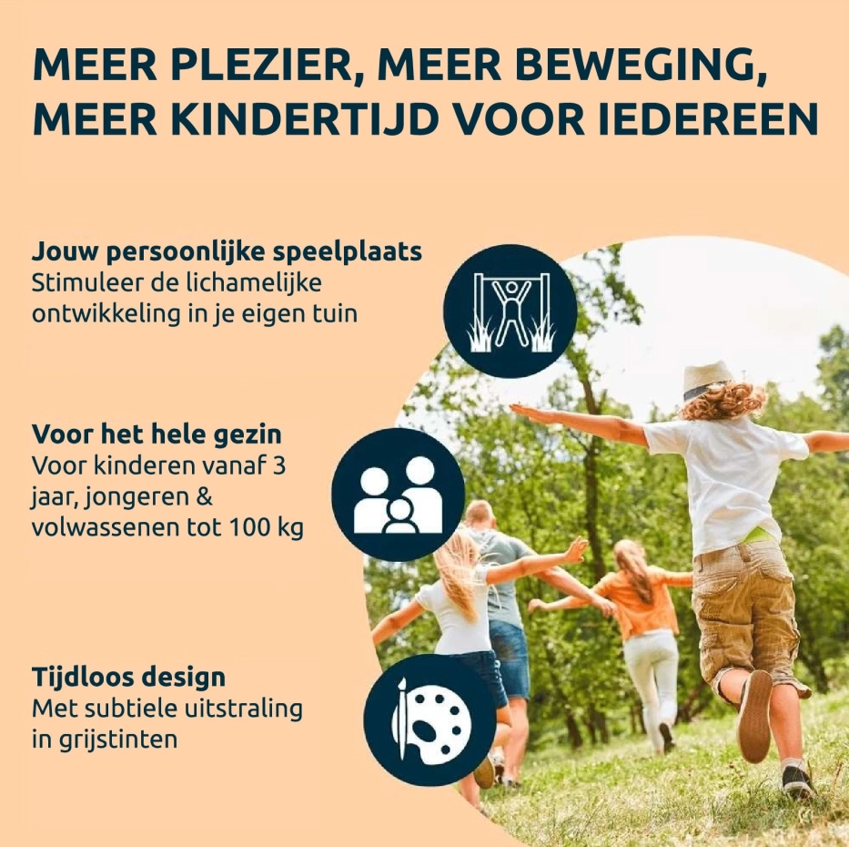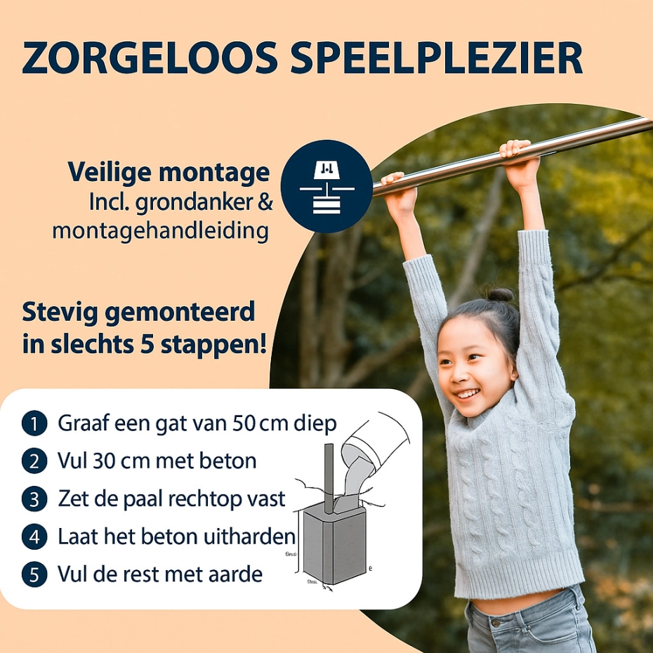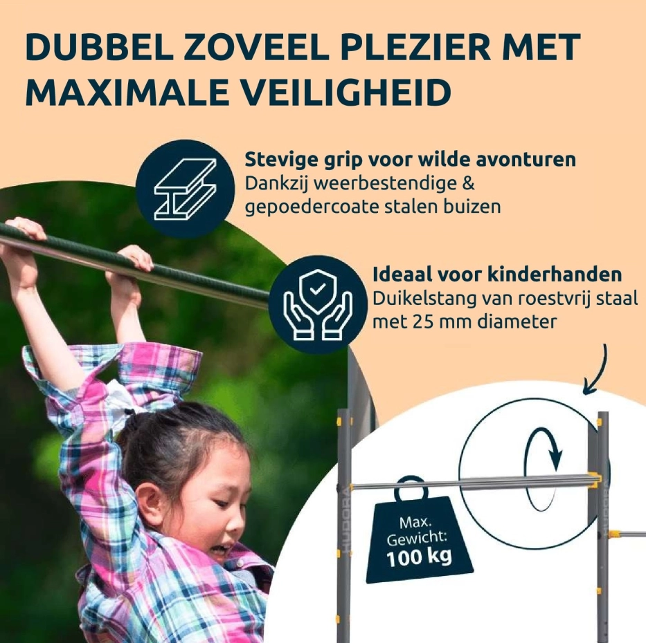 - De duikelstangen zijn op 4 hoogtes te monteren 71 - 98 - 124 - 150cm