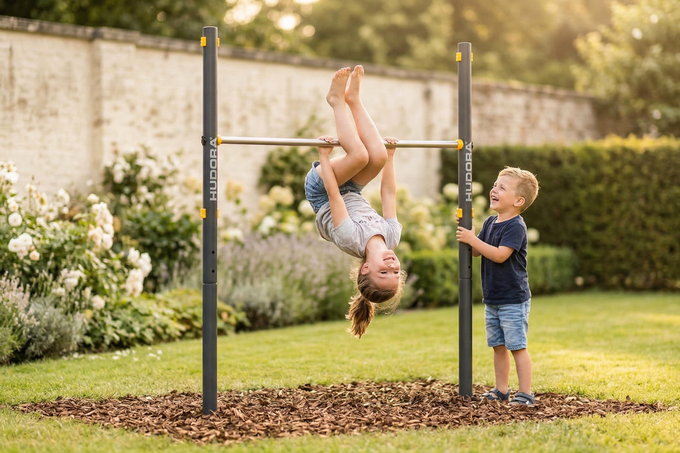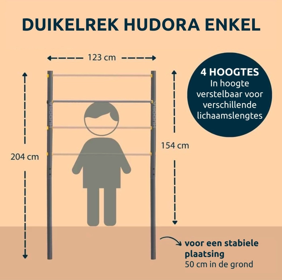 Rekstok Hudora enkel biedt eindeloos speel- en beweegplezier voor kinderen én volwassenen. Dankzij het stevige stalen frame en verstelbare hoogtes is deze rekstok ideaal voor in de tuin. Perfect om motoriek, kracht en plezier te combineren in één toestel. De hoogte is verstelbaar van 71.5 tot 150 cm hoog. Max. gebruikersgewicht is 100 kg. De palen dienen voor stabiliteit verankerd te worden in beton.