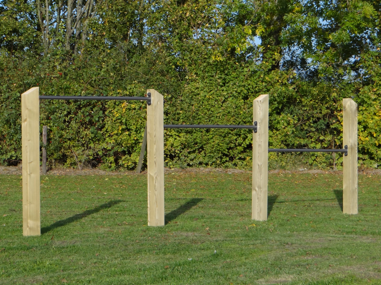 Schitterend triple duikelrek Skill met duikelstang van gepoedercoat staal. Een stevig duikelrek met drie duikelstangen van 125cm en 4 dikke houten palen van 12x12cm, met een lengte van 200cm. Dit prachtige duikelrek voor in uw tuin wordt geleverd incl. bevestigingsmateriaal. Een duikelrek is populair buitenspeelgoed wat weinig ruimte inneemt in uw tuin.