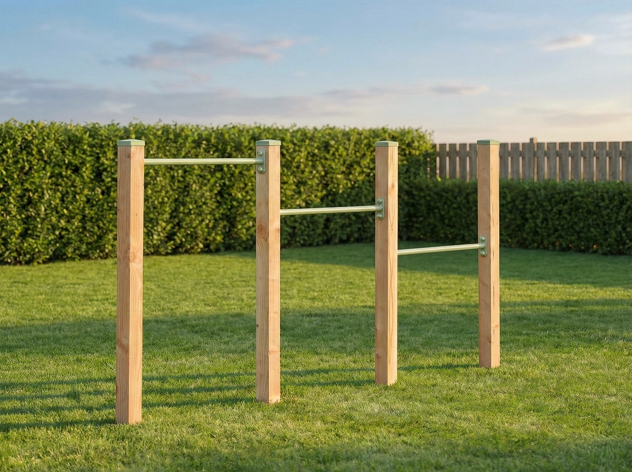 Triple duikelrek met 3 duikelstangen van 90cm. De duikelstangen zijn van pastelgroen gepoedercoat metaal. De vier palen zijn van Douglas hout. Dit grote duikelrek wordt standaard geleverd inclusief afdekkappen op de palen.