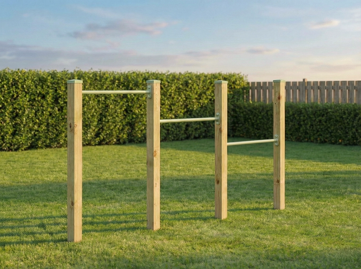 Triple duikelrek met drie pastelgroene gepoedercoate duikelstangen. De duikelstangen zijn 90cm. Ook worden er vier geïmpregneerd vuren houten palen meegeleverd met dit duikelrek. Zo'n duikelrek is een prachtige speel-attractie voor meerdere kinderen tegelijk. Dit grote duikelrek wordt standaard geleverd inclusief de afdekkappen op de palen. Een duikelrek wordt gratis door ons verzonden.