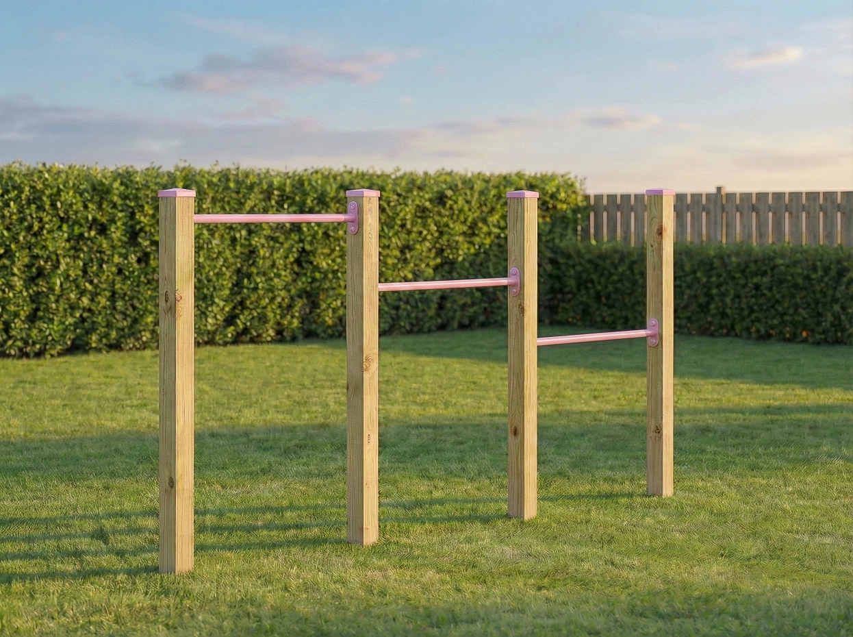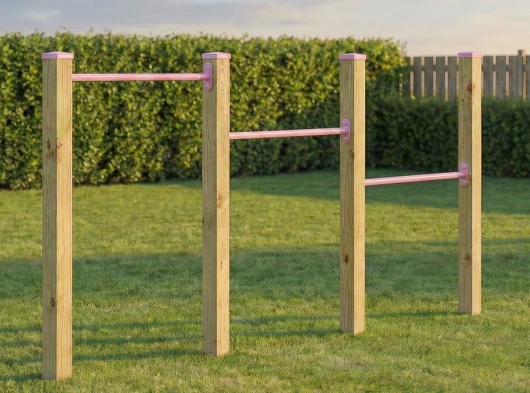 Triple duikelrek met drie pastelroze gepoedercoate duikelstangen. De duikelstangen zijn 90cm. Ook worden er vier geïmpregneerd vuren houten palen meegeleverd met dit duikelrek. Zo'n duikelrek is een prachtige speel-attractie voor meerdere kinderen tegelijk. Dit grote duikelrek wordt standaard geleverd inclusief de afdekkappen op de palen. Een duikelrek wordt gratis door ons verzonden.