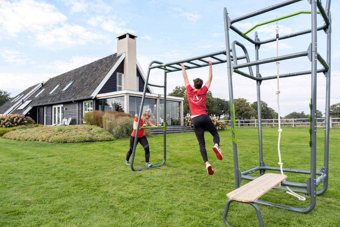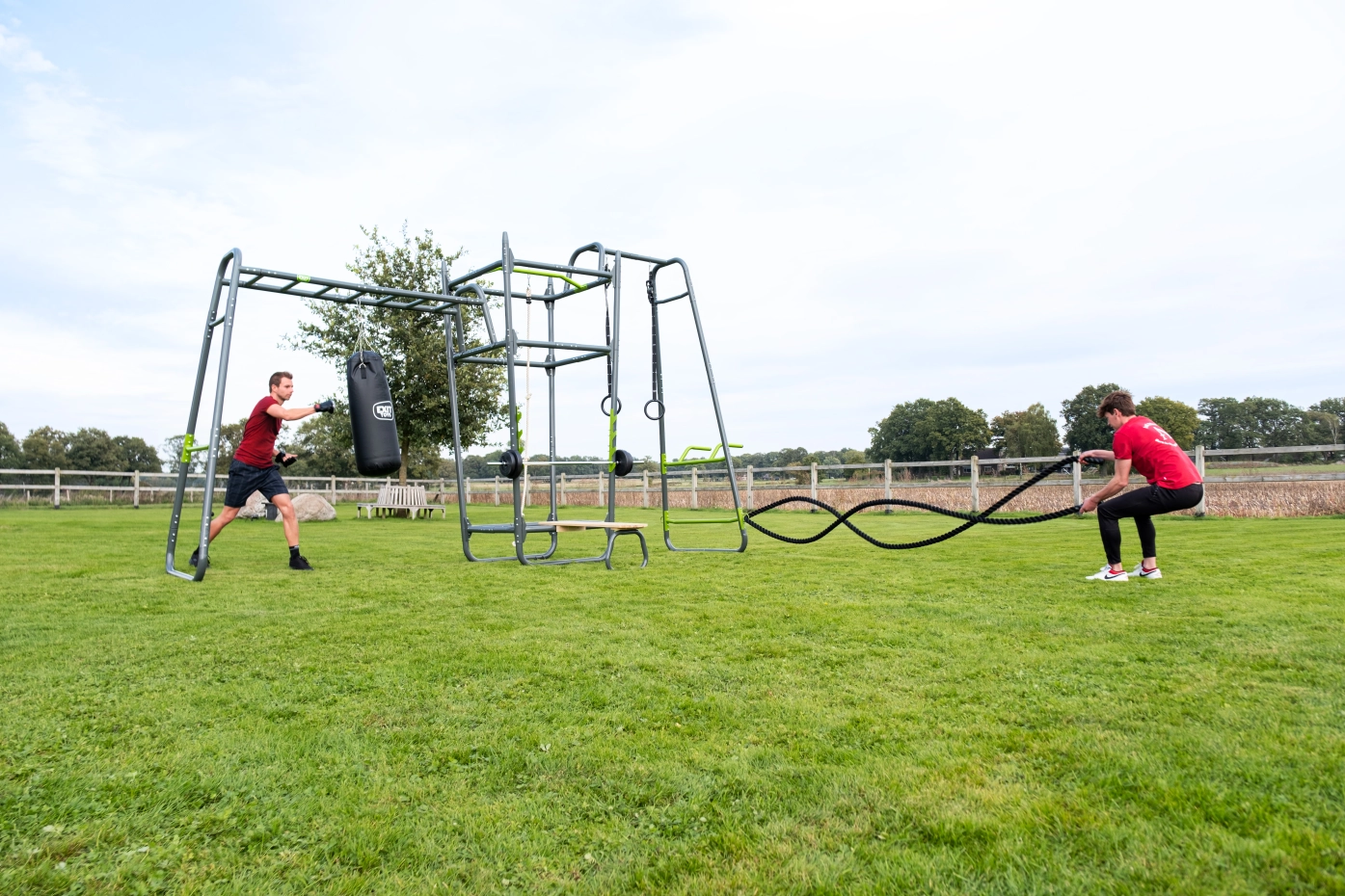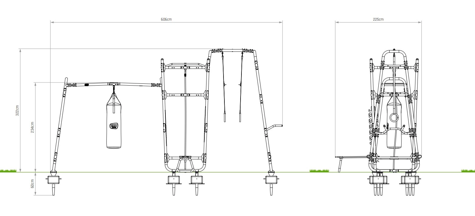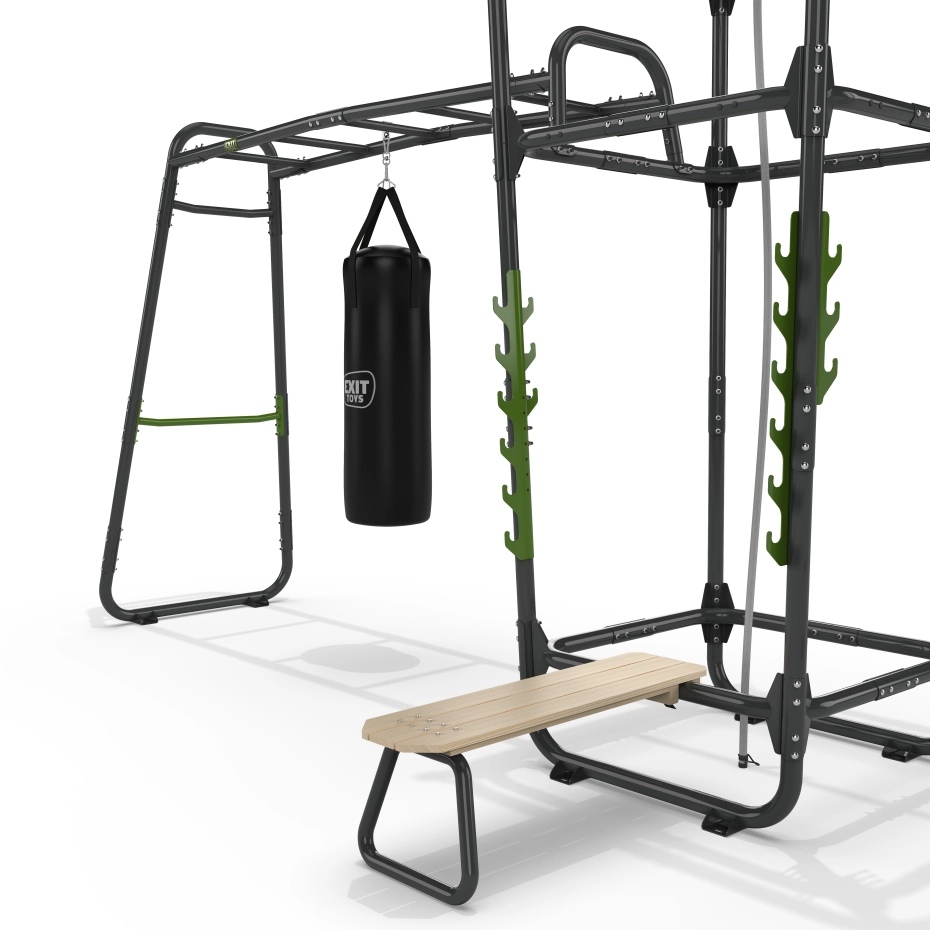 De EXIT GetSet PS610 is een fitnessrek van ruim zes meter voor buiten. De volgende accessoires zijn inbegrepen: oefenstang, bokszak, fitnessbank, haltersteunen, pull-up stang, klimtouw, kunststof turnringen, push-up stang, dip station en battle rope ringen. Deze extra uitgebreide uitvoering is multifunctioneel en biedt volop uitdaging voor sportieve 14-plussers en volwassenen. Haal de sportschool naar jouw huis met de GetSet PS610!