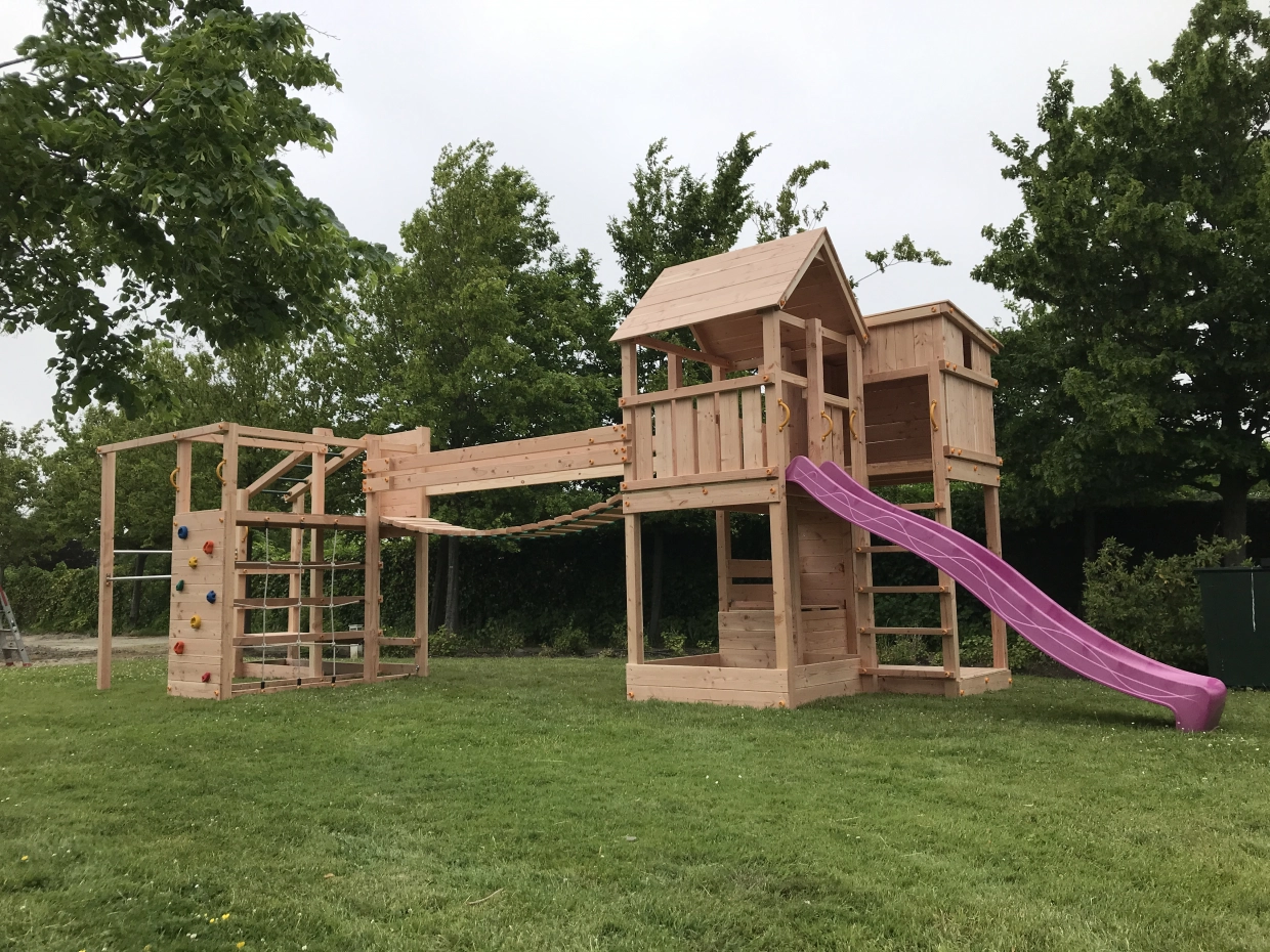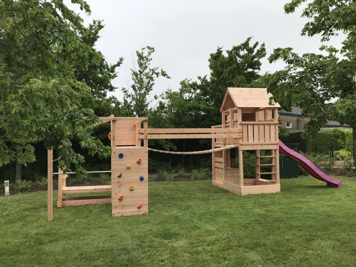 Het speeltoestel wordt compleet geleverd met glijbaan, klimwanden, klimnet, duikelrekken, ruimte voor zandbak, en een apenbrug met monkey bars. Een uitgebreid speeltoestel voor enorm veel speelplezier!