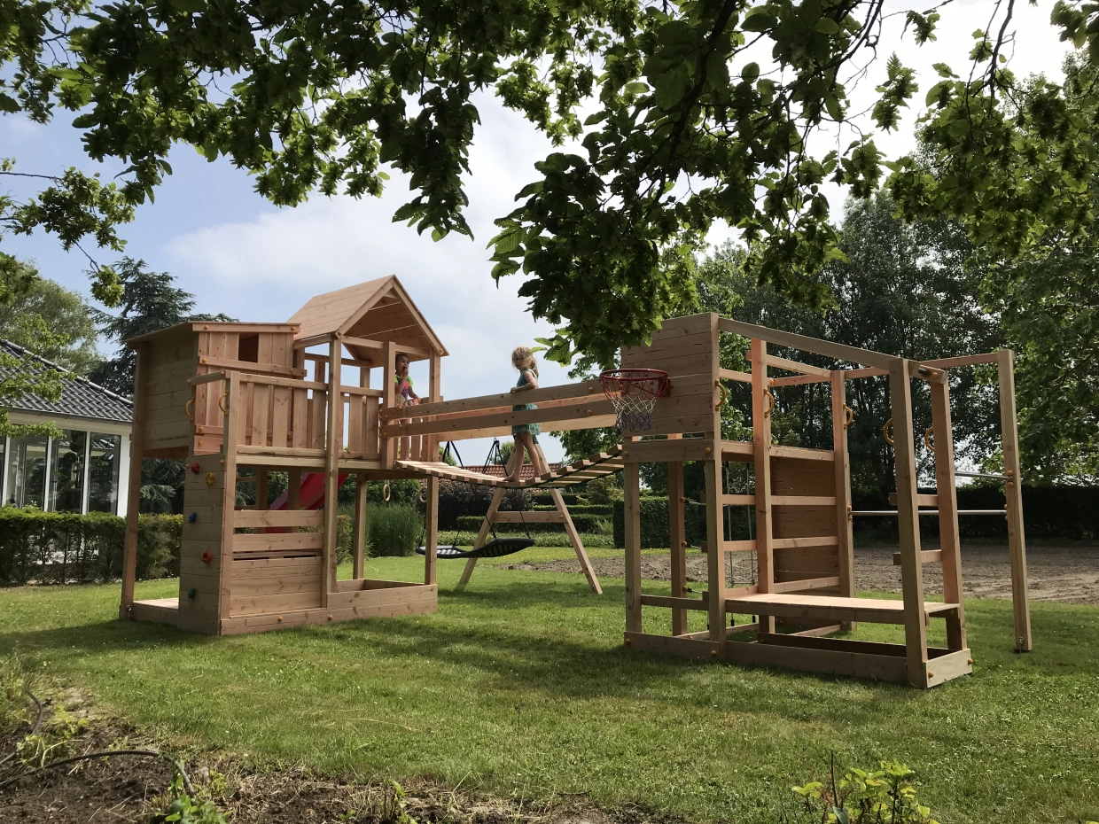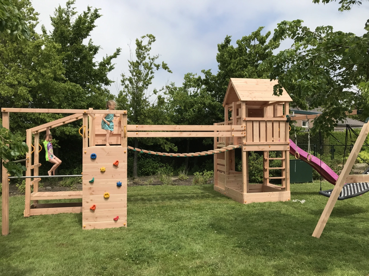 De Ranch is een mooi en groot speeltoestel voor in uw tuin. De Ranch is een uniek ontwerp van GrootPlezier, samengebouwd uit o.a. enkele Blue Rabbit speeltoestellen. Het is een combinatie van speeltoren Palazzo en klimtoestel Crossfit. Beide speeltoestellen zijn met elkaar verbonden door speelbrug Wave DLX, een leuke wiebelende touwbrug. Verder heeft dit grandioze speeltoestel een dubbele schommel, glijbaan, ruimte voor zandbak, klimwanden, duikelrekken, en een apenbrug met monkey bars. Speelplezier gegarandeerd!